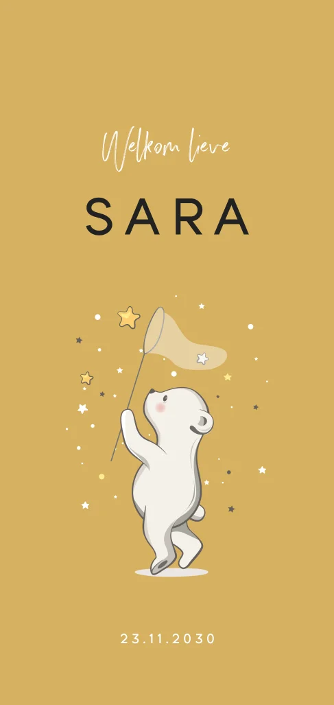 Lief winters geboortekaartje voor je dochter in trendkleur okergeel met daarop een schattige illustratie van een ijsbeertje die sterretjes vangt in een vangnetje.