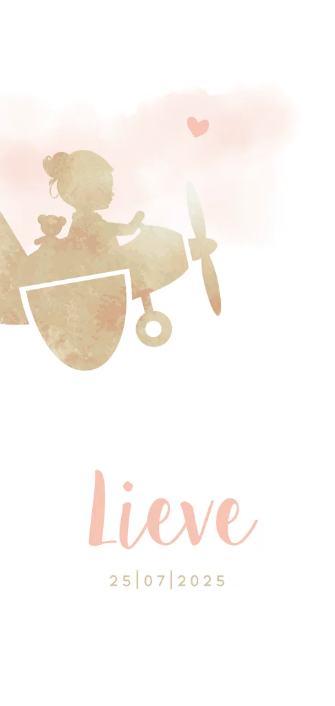 Schattig maar ook stoer geboortekaartje voor je pasgeboren dochter. Met een hip silhouet in peach kleurig waterverf van een meisje in een vliegtuigje.
