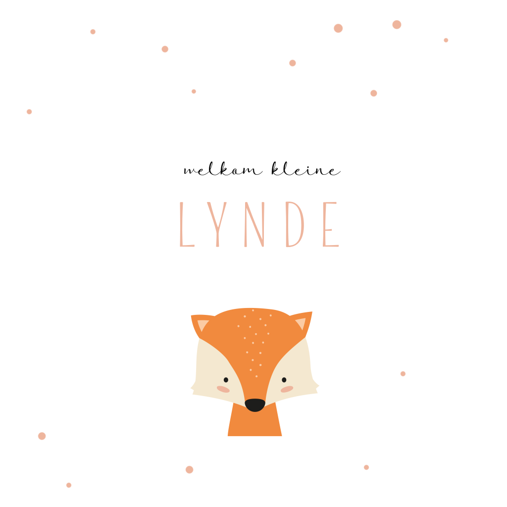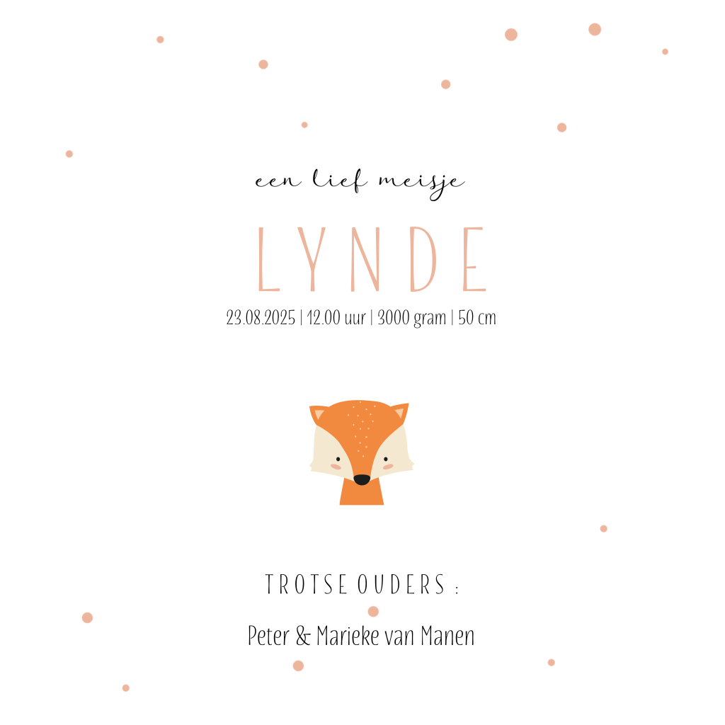Lieve geboortekaart voor jullie dochtertje met kleine peach kleurige stippen op een witte achtergrond en een illustratie van een schattig vosje.