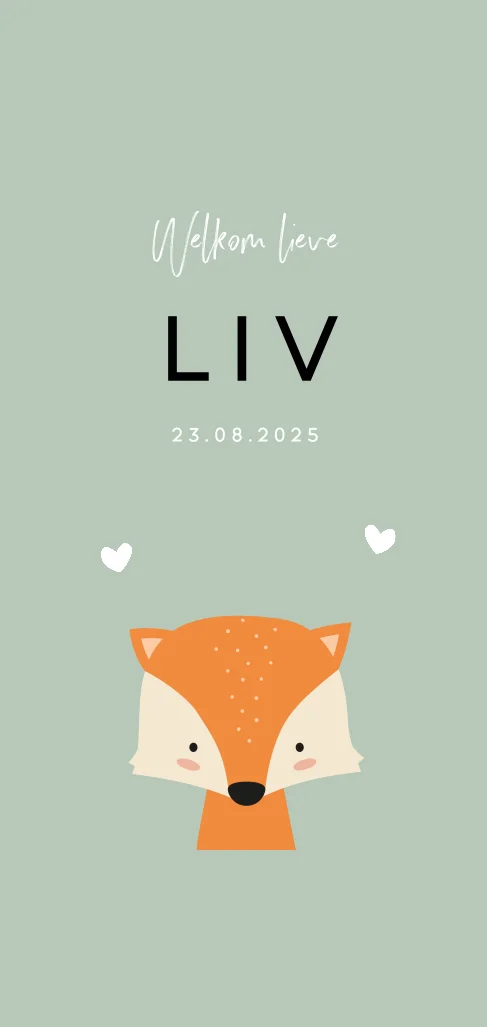 Ben je op zoek naar een hip geboortekaartje voor je pasgeboren dochtertje? Dan is dit kaartje helemaal wat je zoekt! Met een hippe illustratie van een lief vosje en twee witte hartjes. De olijfgroene achtergrond maken dit echt een stoer geboortekaartje! Liever een andere kleur op de achtergrond? Pas dit kaartje eenvoudig aan in de online editor!