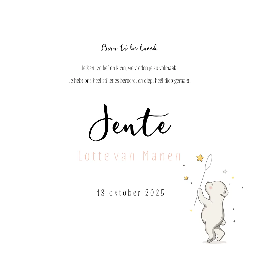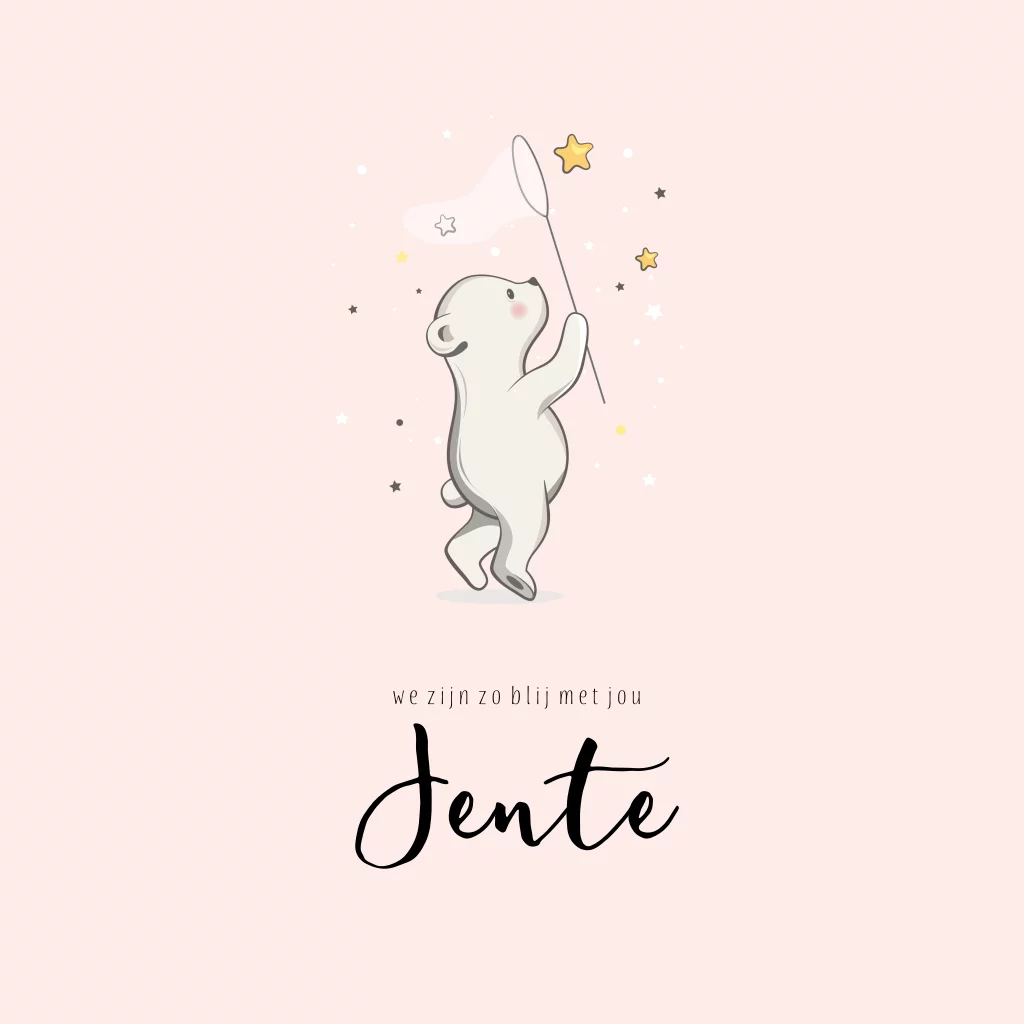 Lieve geboortekaart voor je pasgeboren dochtertje met een schattige illustratie van een ijsbeertje die met zijn vangnetje sterretjes aan het vangen is.
