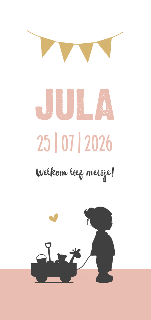Staand geboortekaartje met gele vlaggetjes en een silhouet van een meisje met een speelgoedkar.