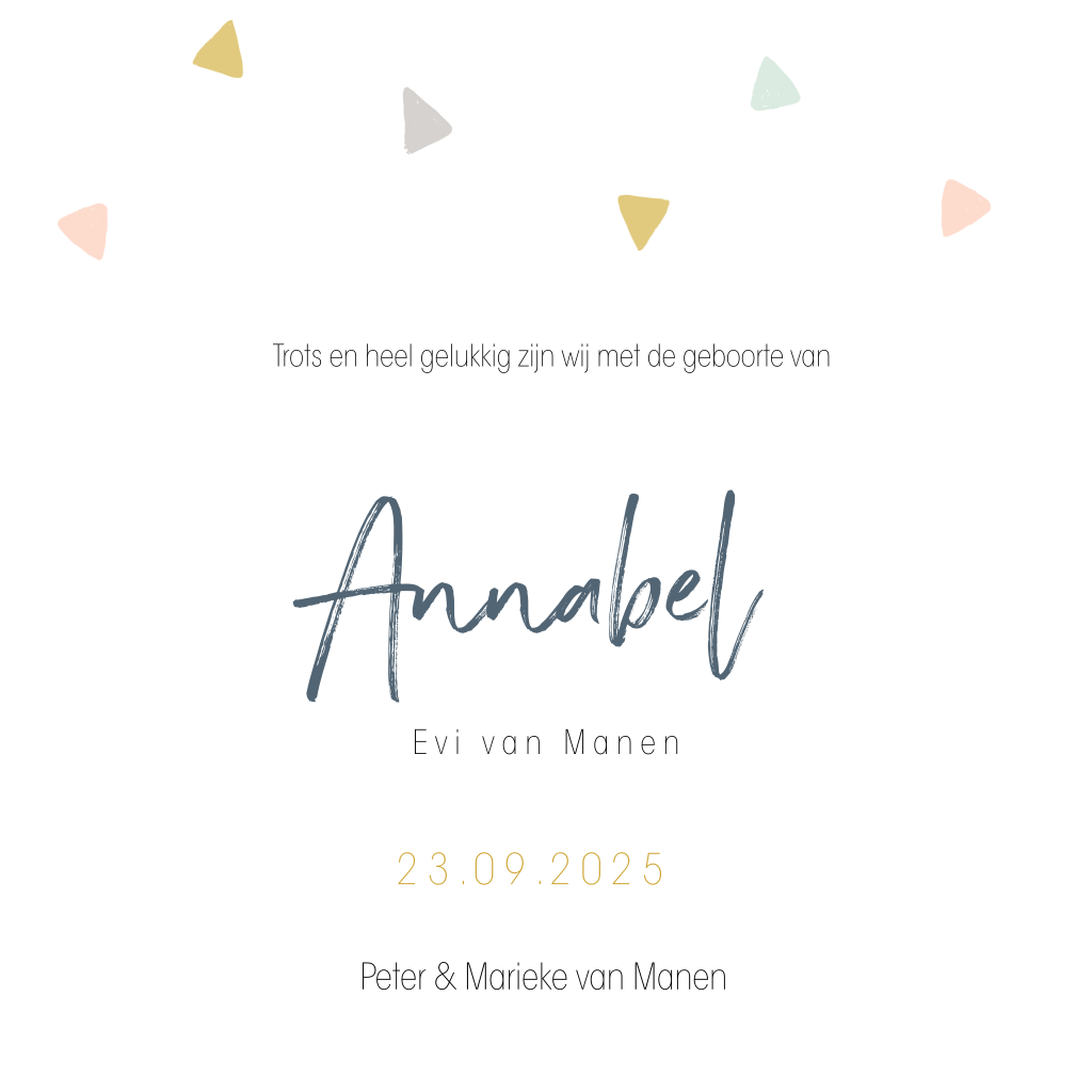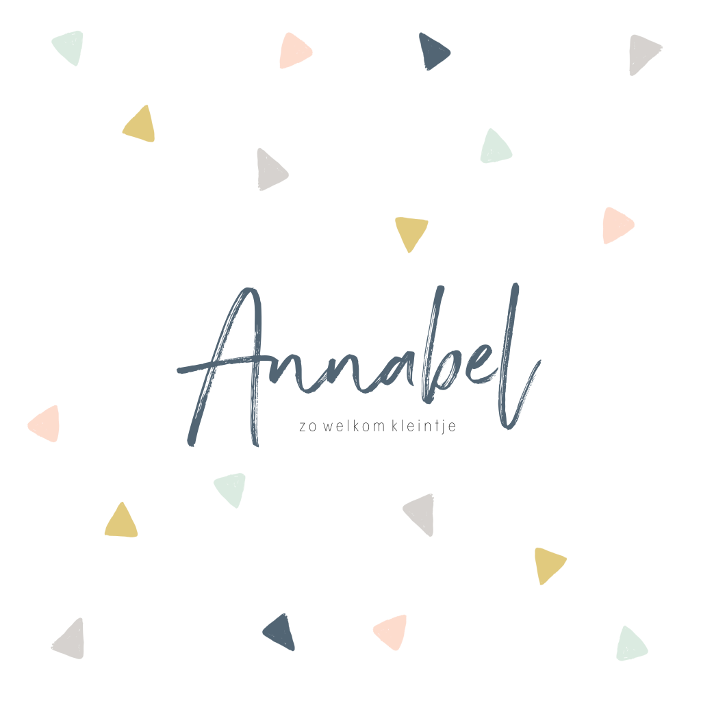 Allemaal gekleurde driehoekjes, wat vrolijk! Dit vierkante geboortekaartje is leuk voor een meisje. De naam lijkt met een stift geschreven, wat een tof effect geeft!