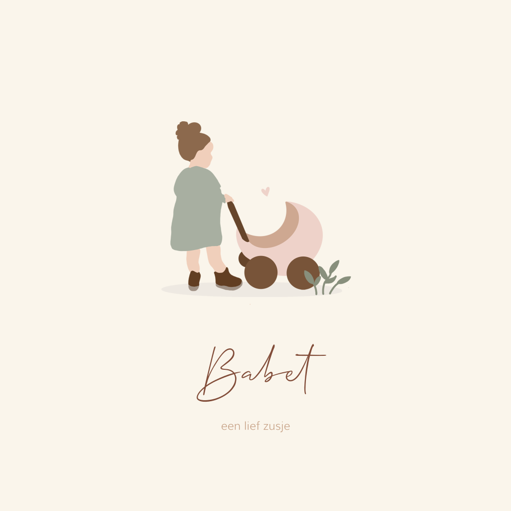 Lief geboortekaartje met de tekening van een grote zus met kinderwagen