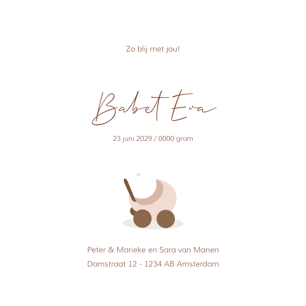 Dit is een lief kaartje voor de geboorte van jullie dochter en zusje. Een grote zus loopt met een roze kinderwagen waarin haar kleine zusje ligt. Pas het kaartje naar wens aan in onze online editor en bestel snel een proefdruk om dit kaartje in het echt te zien!