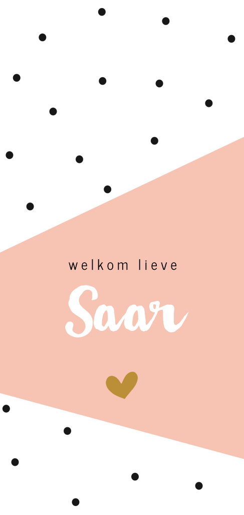 Een hip kaartje voor een meisje! Met zwarte stippen op de achtergrond en een stijlvol roze vlak met een hartje in goudlook. Je kunt de kleuren, teksten en lettertypes nog helemaal aanpassen aan jouw wensen!
