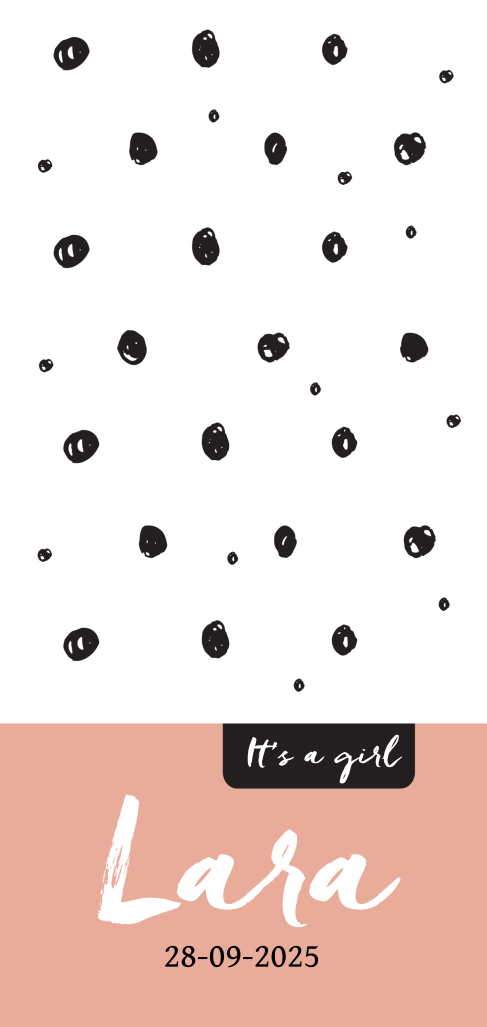 Hip geboortekaartje met zwarte handgetekende stippen en een roze strook onderaan. Pas de kleur roze aan bij achtergrondkleur.