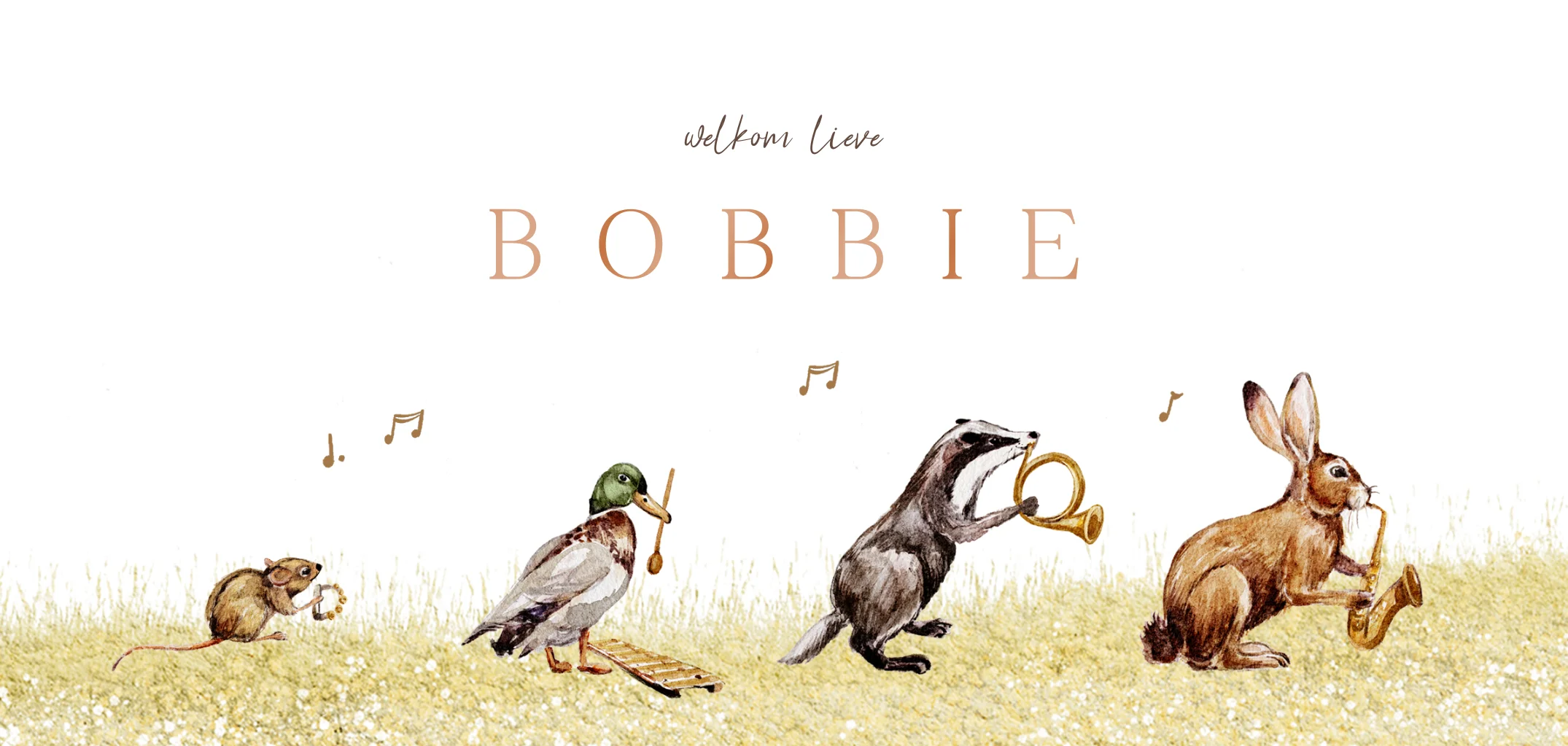 Dit is een vrolijk geboortekaartje voor jullie zoon of dochter. Op het kaartje zijn een muis, eend, wasbeer en konijn te zien. Ieder dier bespeelt een instrument, waardoor het een feestelijke optocht is. Benieuwd naar dit kaartje? Bewerk het kaartje in onze online editor, bestel een proefdruk en bewonder het kaartje in het echt!