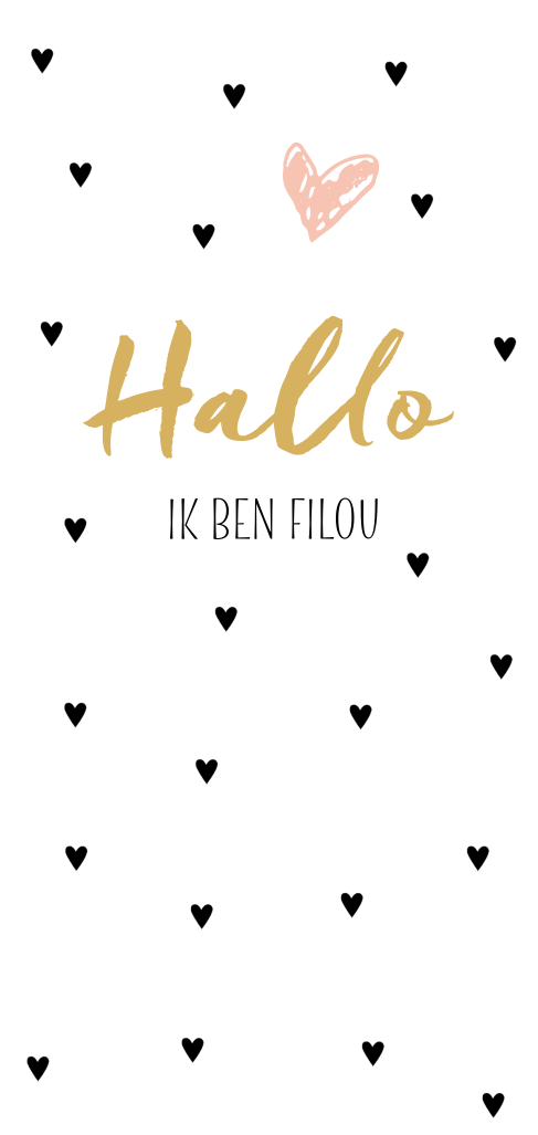 Vrolijk geboortekaartje met zwarte hartjes en stoere typografie. Teksten en kleuren kan je naar wens aanpassen.