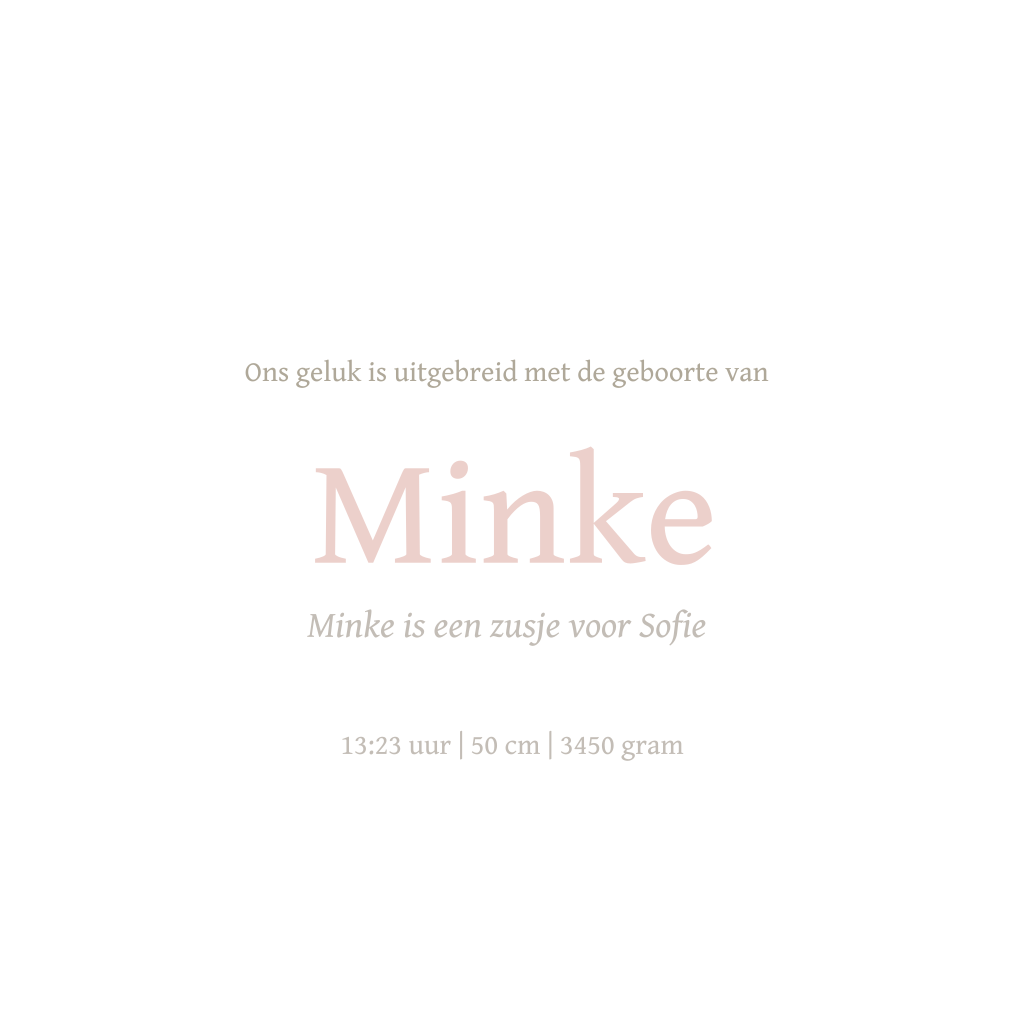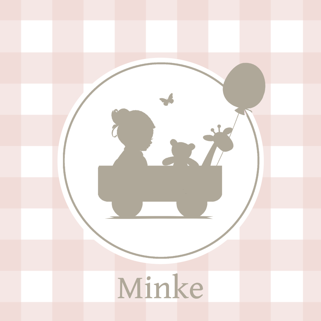 Roze geboortekaartje met ruitjes en een silhouet van een meisje in een kar met beer en girafje