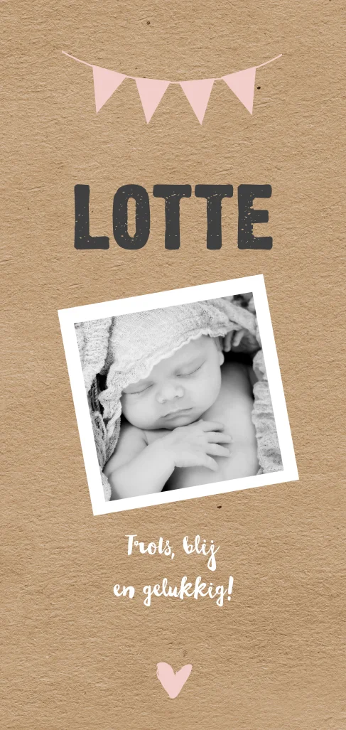 Geboortekaartje voor een meisje met een kraftlook achtergrond en een roze vlaggenlijn. Leuk met foto, maar kan ook zonder foto.