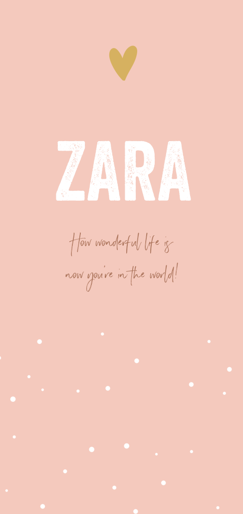 Wat een lief, hip geboortekaartje voor een meisje! In zachtroze, met witte stipjes en een hartje in goudlook. How wonderful life is now you're in the world! Maak hem zelf af.