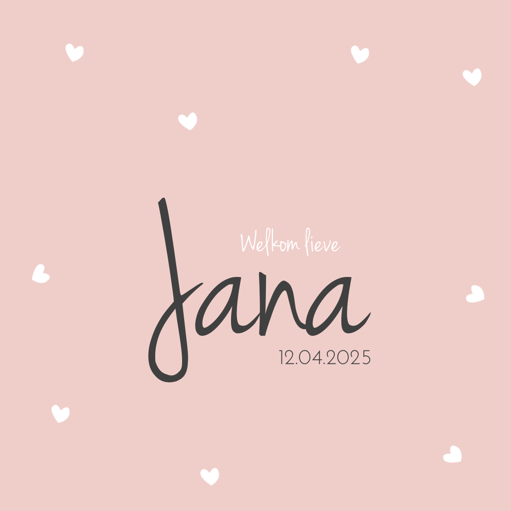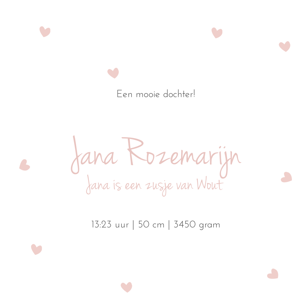 Schattig geboortekaartje met roze achtergrond en witte kleine hartjes.