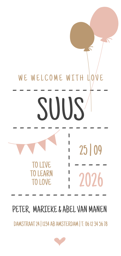 Geboortekaartje met roze en koper-kleurige ballonnen en een vlaggenlijntje. Vul de gegevens van je kindje zelf in.