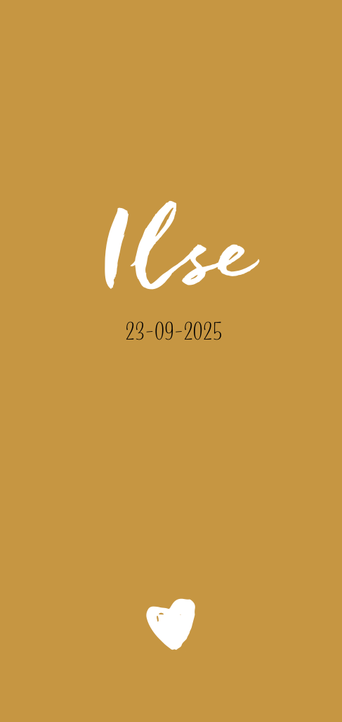 Eenvoudig geboortekaartje met mooie okergele achtergrond en een wit hartje. Prachtig kaartje voor een herfstkindje.