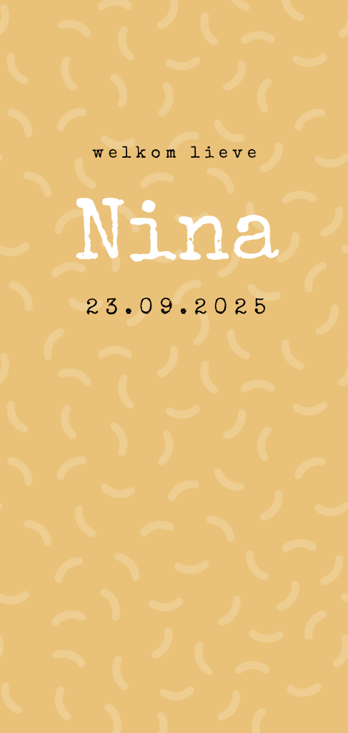 Supertrendy, langwerpig geboortekaartje met okergele achtergrond en illustratieve print! Leuk voor een meisje. Liever een andere kleur? Pas dit eenvoudig aan in de editor.