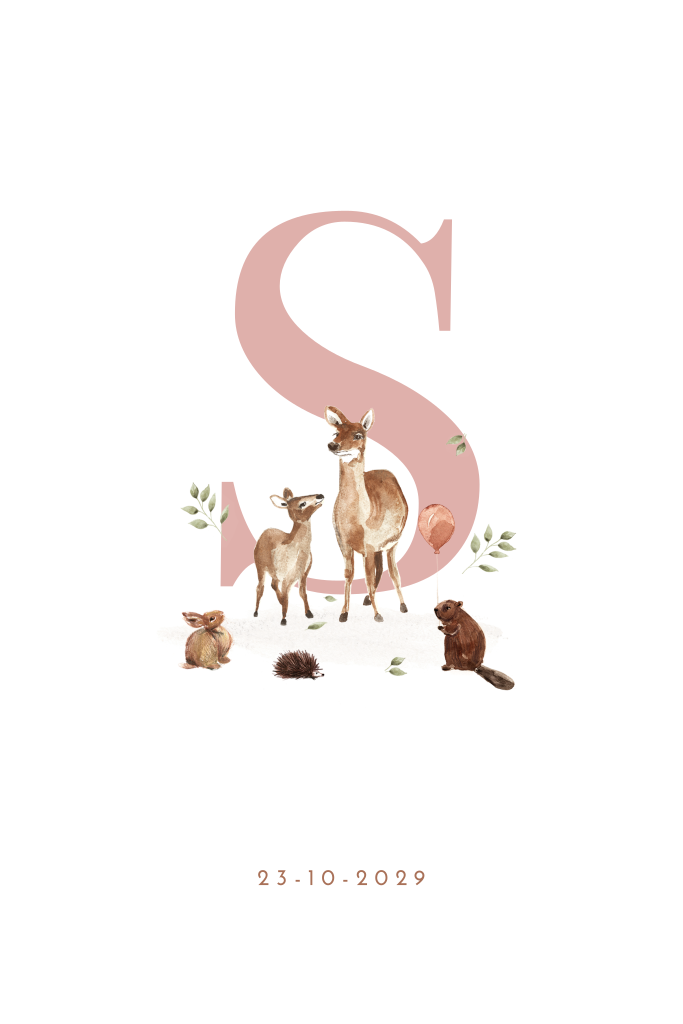 Een roségoudfolie geboortekaartje voor jullie dochtertje. Het kaartje heeft illustraties van verschillende bosdieren, zoals een hertje, konijntje en egel. Naast de bosdieren zie je een groot initiaal van jullie dochters op het kaartje. Het initiaal kan je gemakkelijk in onze online editor aanpassen. De volledige naam van jullie dochter is in roségoudfolie gedrukt.