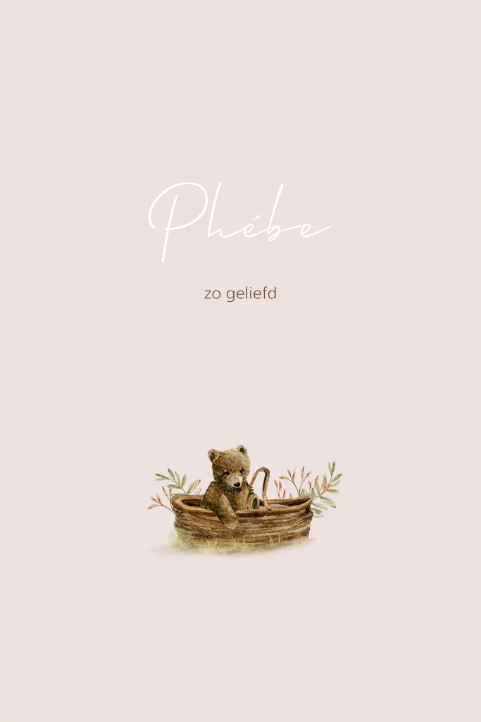 Kondig de geboorte van jullie dochter aan met dit lieve kaartje! Het kaartje heeft een lichtroze achtergrond waartegen de tekening van een beertje in een mand mooi naar voren komt. De naam wordt gedrukt in koperfolie en geeft dit kaartje een luxe effect.