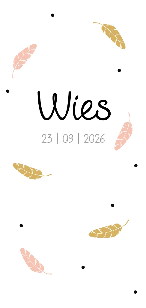 Hip geboortekaartje voor een meisje met gele en roze veertjes in herfstkleuren en stippen op de achtergrond. De kleuren van de veertjes kunnen eventueel aangepast worden in onze editor.