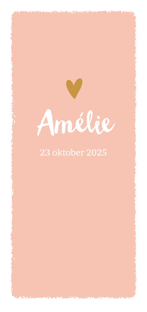 Geboortekaartje voor een meisje met een roze vlak en witte rand met daarop een okergeel hartje.