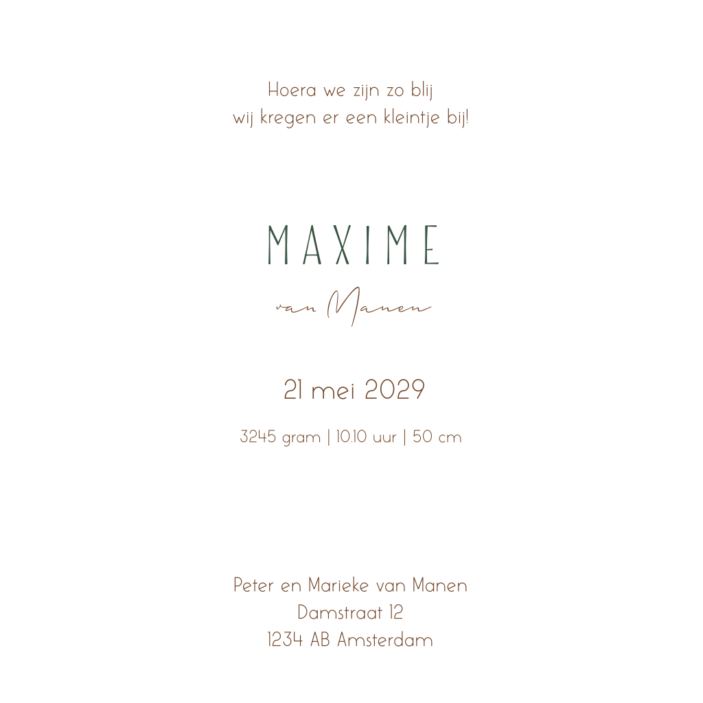 Dit is een stoer kaartje voor jullie pasgeboren zoon of dochter. Centraal op het kaartje zijn twee leeuwen te zien bij een bananenboom. Het kaartje kan helemaal naar wens aangepast worden in onze online editor.