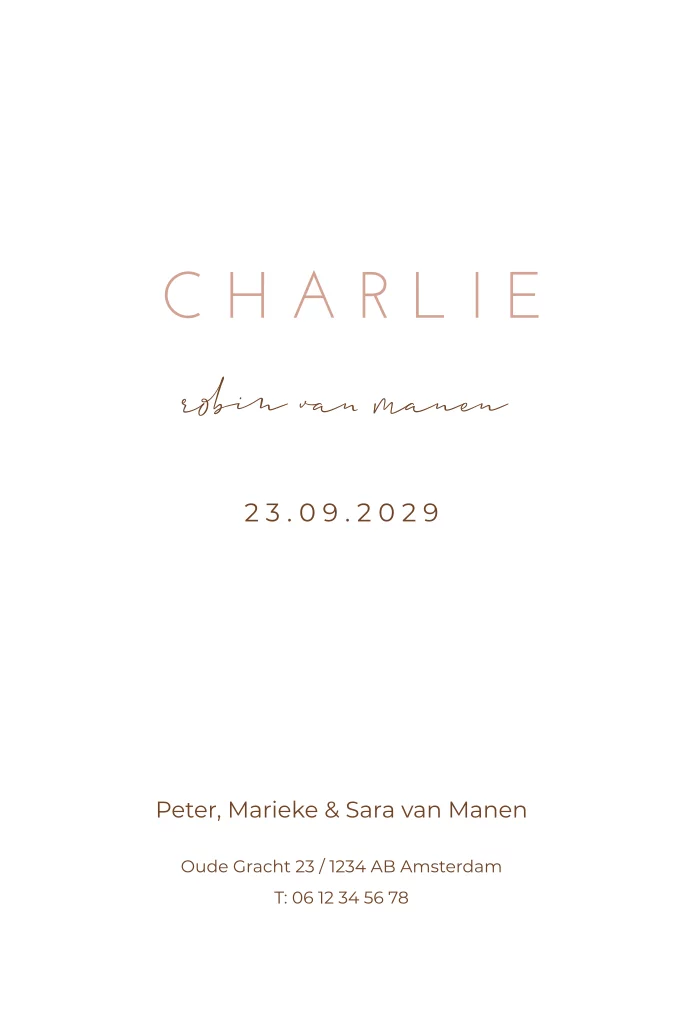 Dit is een mooi kaartje voor jullie pasgeboren zoon of dochter. Op het kaartje staan de tekeningen van een hertje en vogels. De naam wordt gedrukt in roségoudfolie. Pas het kaartje naar wens aan in onze online editor en bestel snel een proefdruk om dit kaartje in het echt te zien!