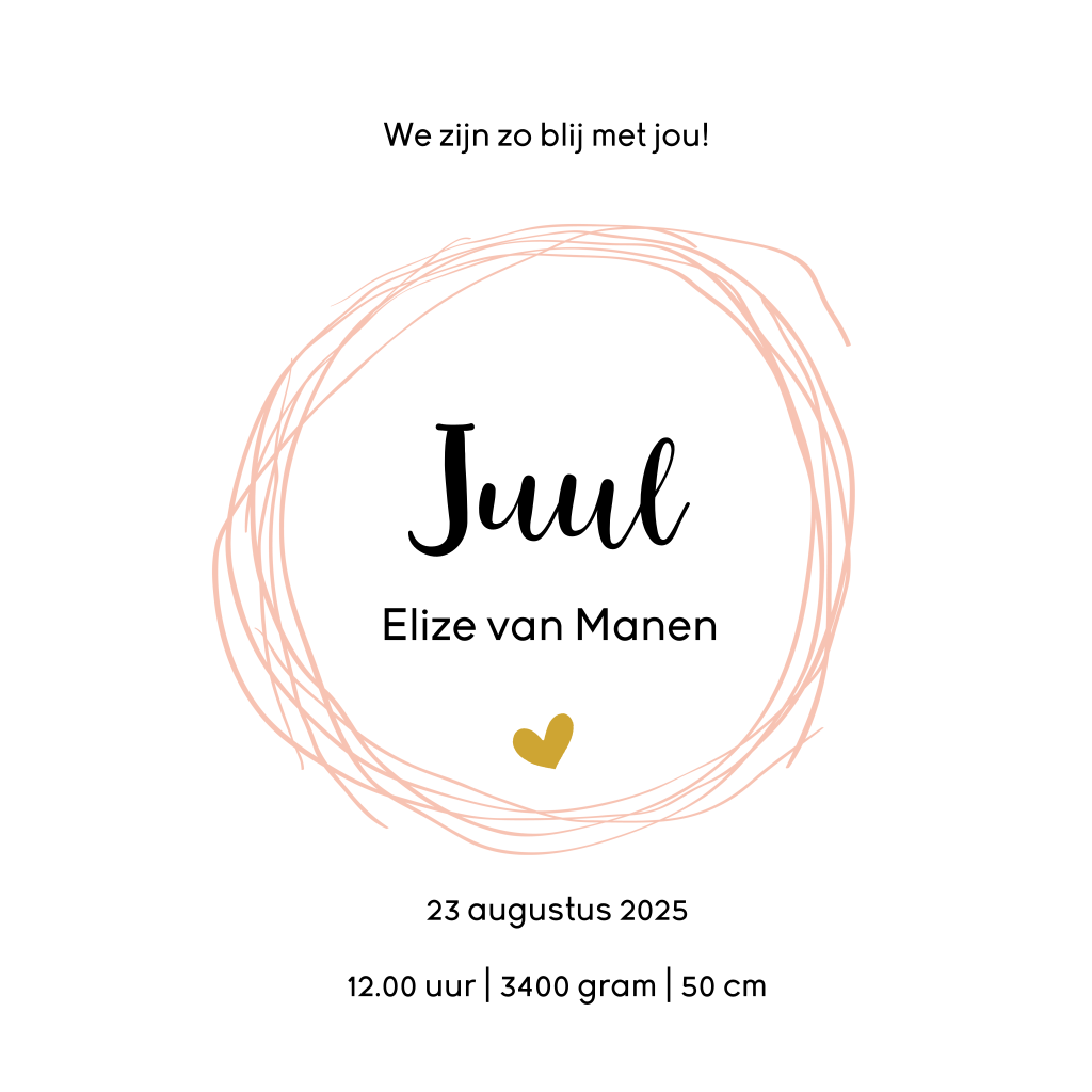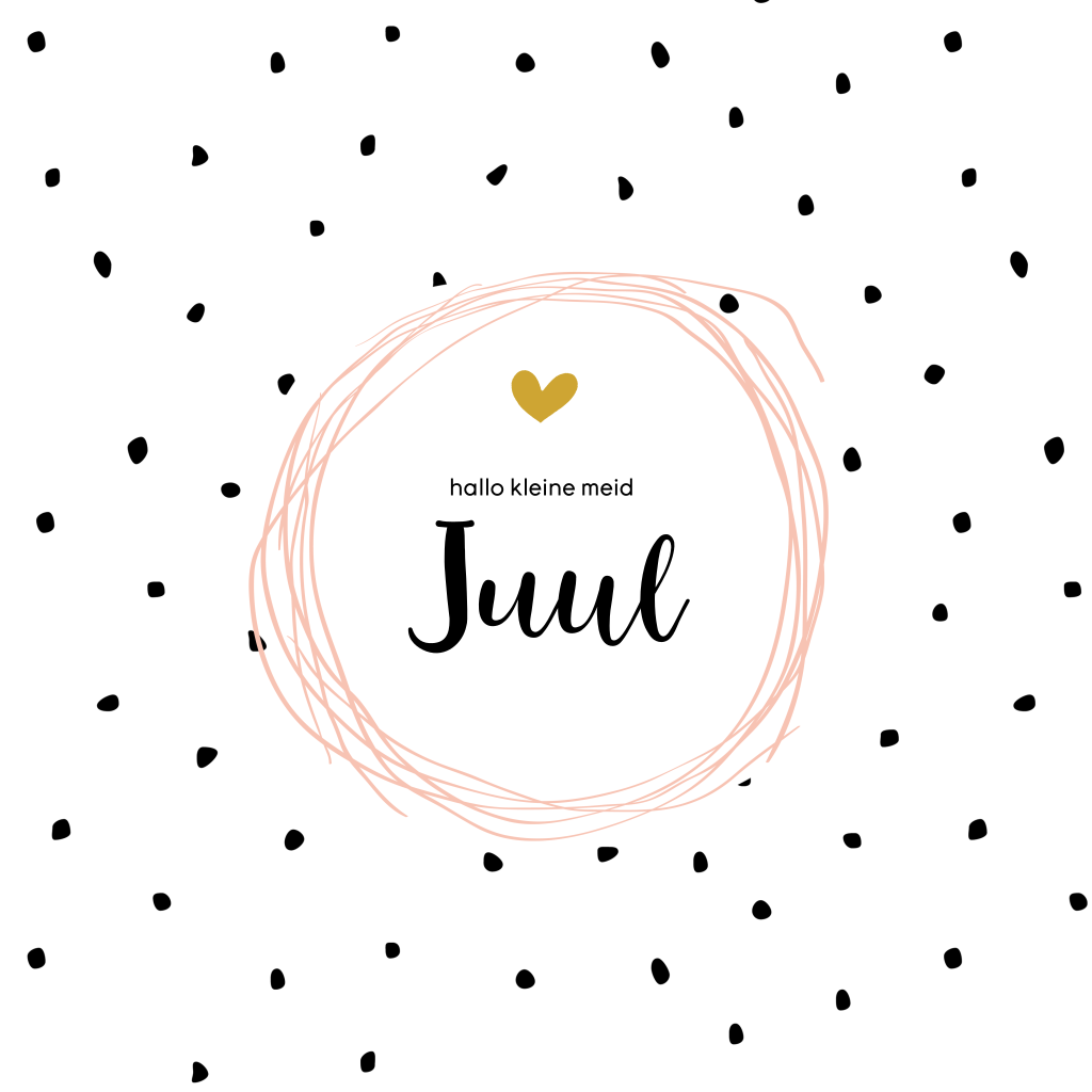 Mooi modern meisjesgeboortekaartje! Met een achtergrond van zwarte stippen, een roze cirkel om de naam en een klein hartje in goudlook. Dit geboortekaartje is ontworpen door Fientje & Co en kun je zelf nog aanpassen, door bijvoorbeeld een eigen lettertype te kiezen!