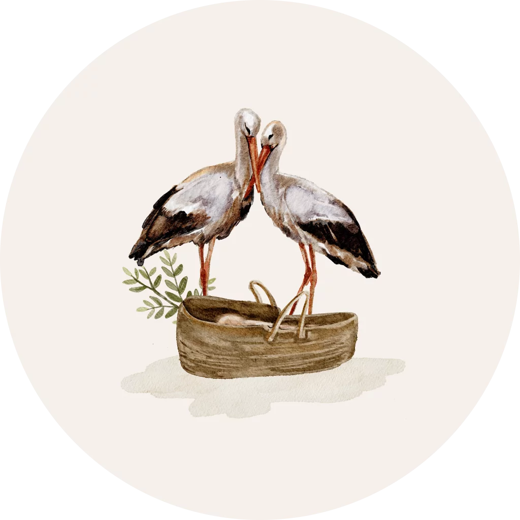 Een stijlvolle sluitsticker passend bij het geboortekaartje van jouw kindje. De sticker heeft een beige achtergrond met daarop twee ooievaars. Daarnaast zie je een lief mandje. Pas het ontwerp naar wens aan in onze online.
