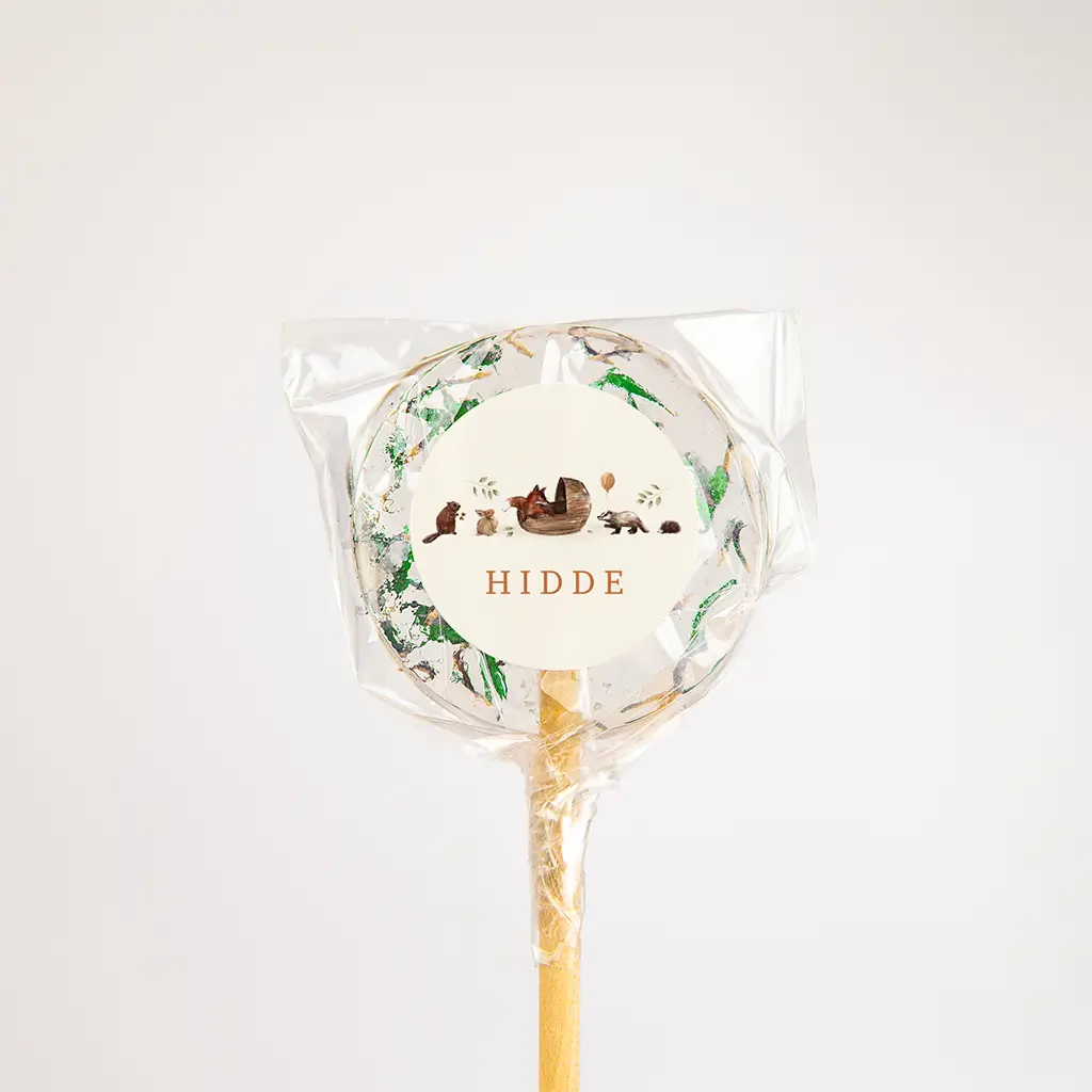 Dit is een schattige naamsticker die past bij het kaartje van Fientje & Co. De getekende bosdieren en het getekende wiegje komen mooi naar voren tegen de lichte achtergrond.
