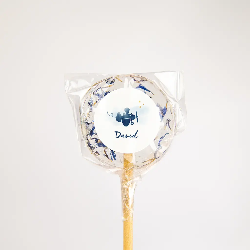 Lieve sticker voor je zoontje met een blauw watercolour silhouet van een jongetje in een vliegtuig. De drie goudlook sterretjes maken deze naamticker af. De sticker past bij het originele geboortekaartje van Fientje & Co.