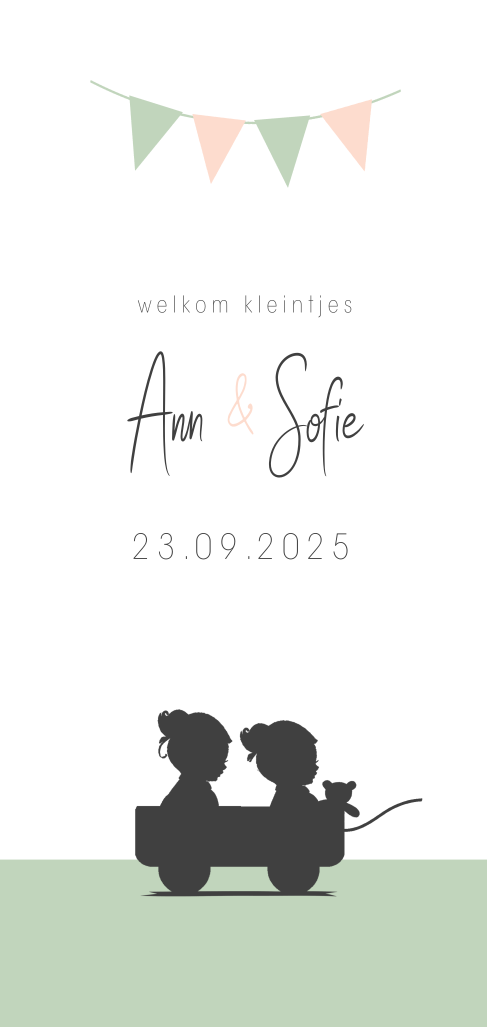 Twee meisjes met een knuffelbeer in een karretje, wat lief! Dit staande geboortekaartje voor een tweeling is versierd met vrolijke vlaggetjes in roze en groen en een sierlijk lettertype.