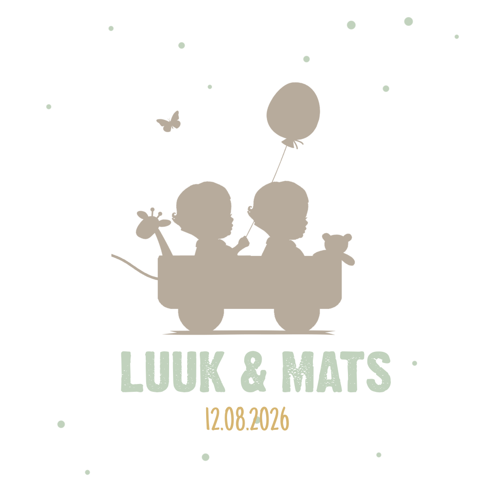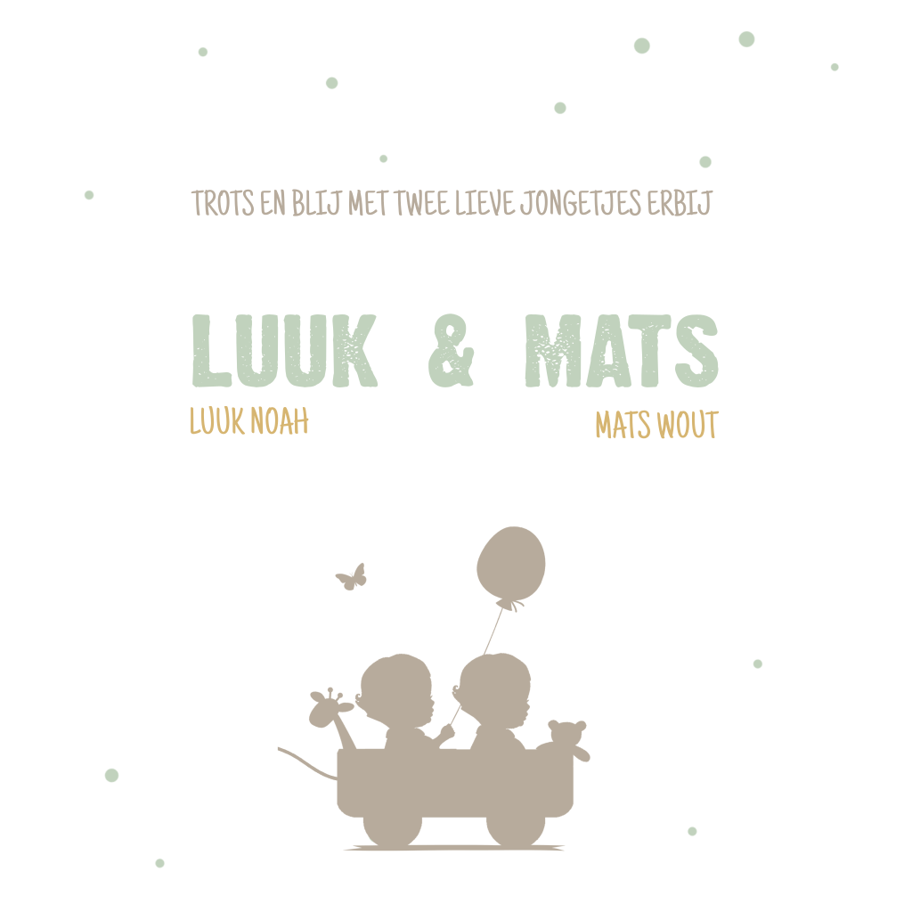 Geboortekaartje voor een tweeling met een silhouet van twee jongetjes in een kar met speelgoeddieren