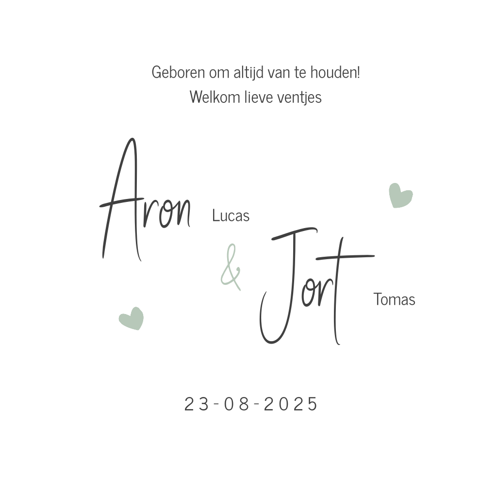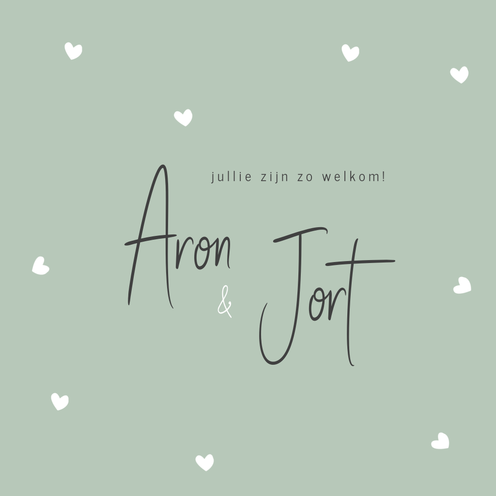 Trendy letters en witte hartjes maken dit een sierlijk en lief geboortekaartje voor een tweeling! Achtergrondkleuren zijn naar wens aan te passen in de online editor. Jullie zijn zo welkom, jongens!