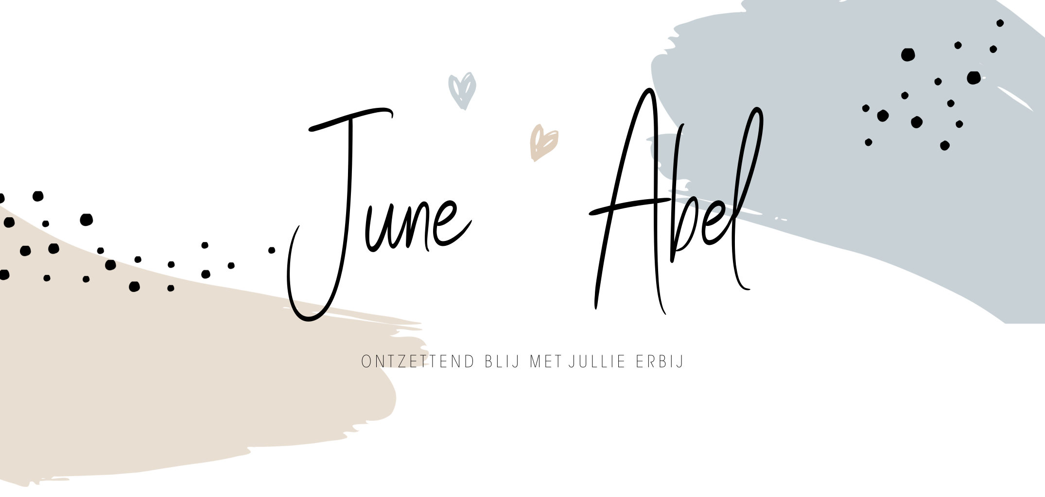 Liggend, hip geboortekaartje met verfstrepen in blauw en taupe kleuren, vrolijke stippen en kleine getekende hartjes. Het kaartje is ontworpen voor een tweeling. Kleuren zijn naar wens aan te passen!