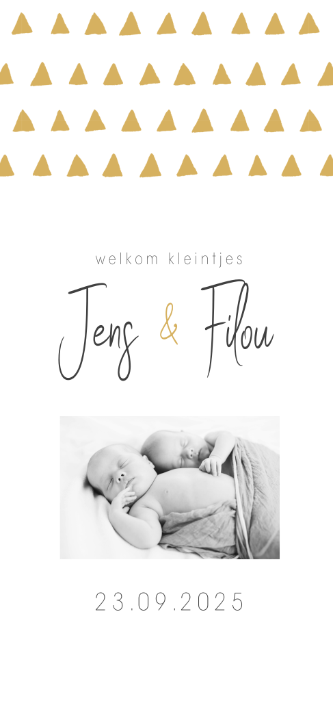 Trendy geboortekaartje voor een tweeling met een patroon van okergele driehoekjes. Voeg een persoonlijke foto toe en maak dit kaartje helemaal af!