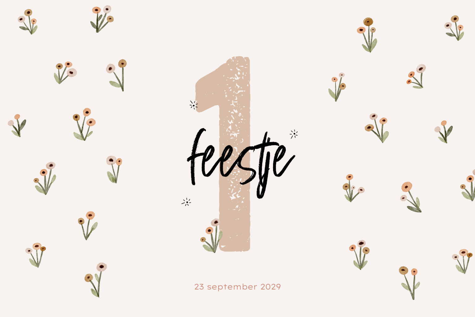 Een lieve uitnodiging voor de eerste verjaardag van jullie dochter. Op de uitnodiging zie je een printje met schattige bloemetjes. Personaliseer dit kaartje volledig in onze online editor.