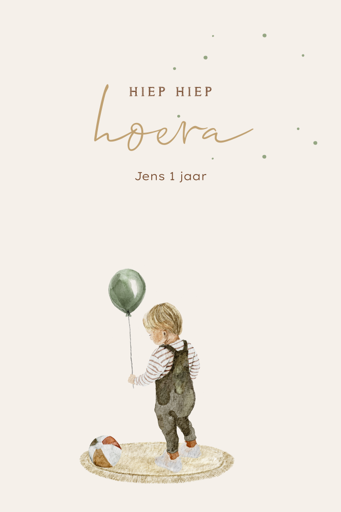 Hiep, hiep, hoera! Dit is een prachtige uitnodiging voor jullie jarige zoon. Centraal op het kaartje staat de illustratie van een jongetje met een groene ballon in zijn hand. Personaliseer het kaartje in onze online editor en bestel een proefdruk om dit kaartje in het echt te zien!