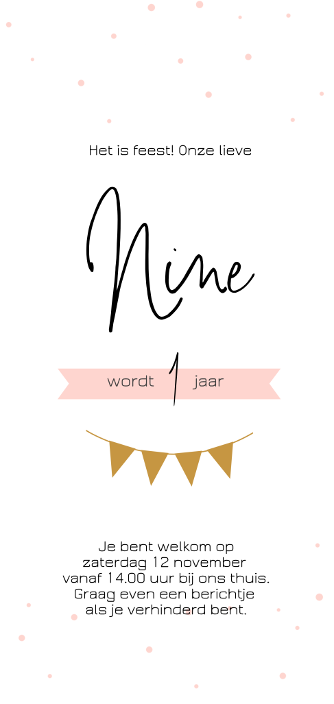 Feestelijke, langwerpige uitnodigingskaart met gele vlaggetjes, een roze banner en kleine roze stipjes op de achtergrond. Leuk voor een meisje dat 1 jaar wordt!