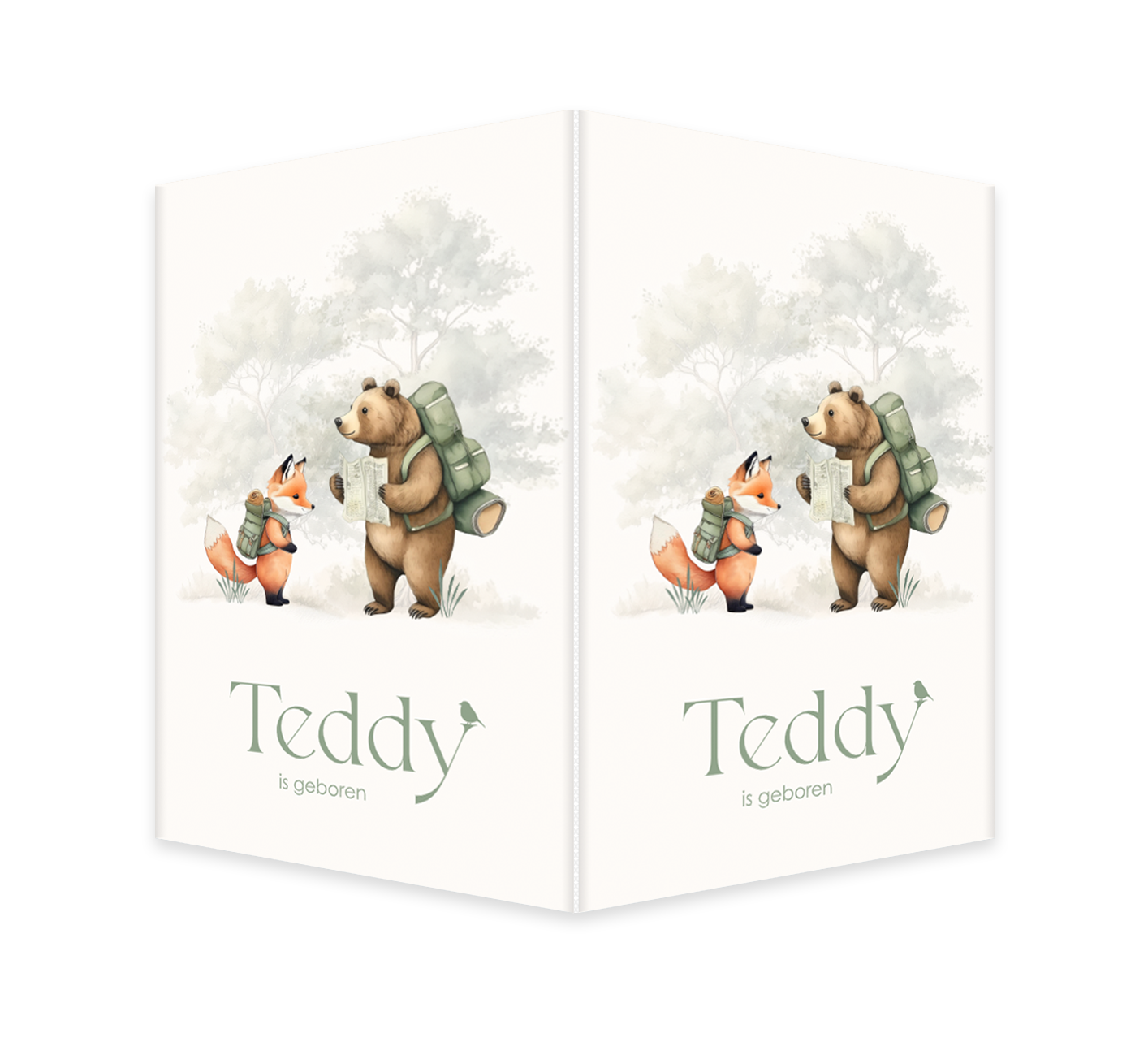 Een vrolijk staand raambord om de geboorte van jouw kindje aan te kondigen! Het bord heeft leuke illustraties van een vosje en een beer met rugzakjes om, daarboven is ruimte voor de naam van het kindje.
