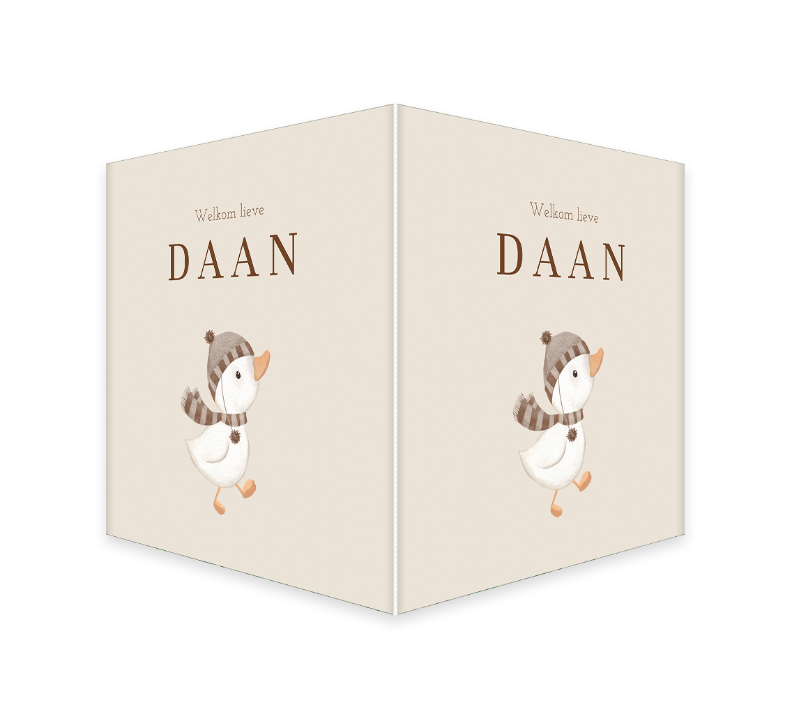 Een vierkant geboortebord voor jouw kindje. Het bord heeft een beige achtergrond met daarop een lieve illustratie van een winters eendje. Het eendje heeft een muts op en sjaal om. Pas het raambord naar wens aan in onze online editor.