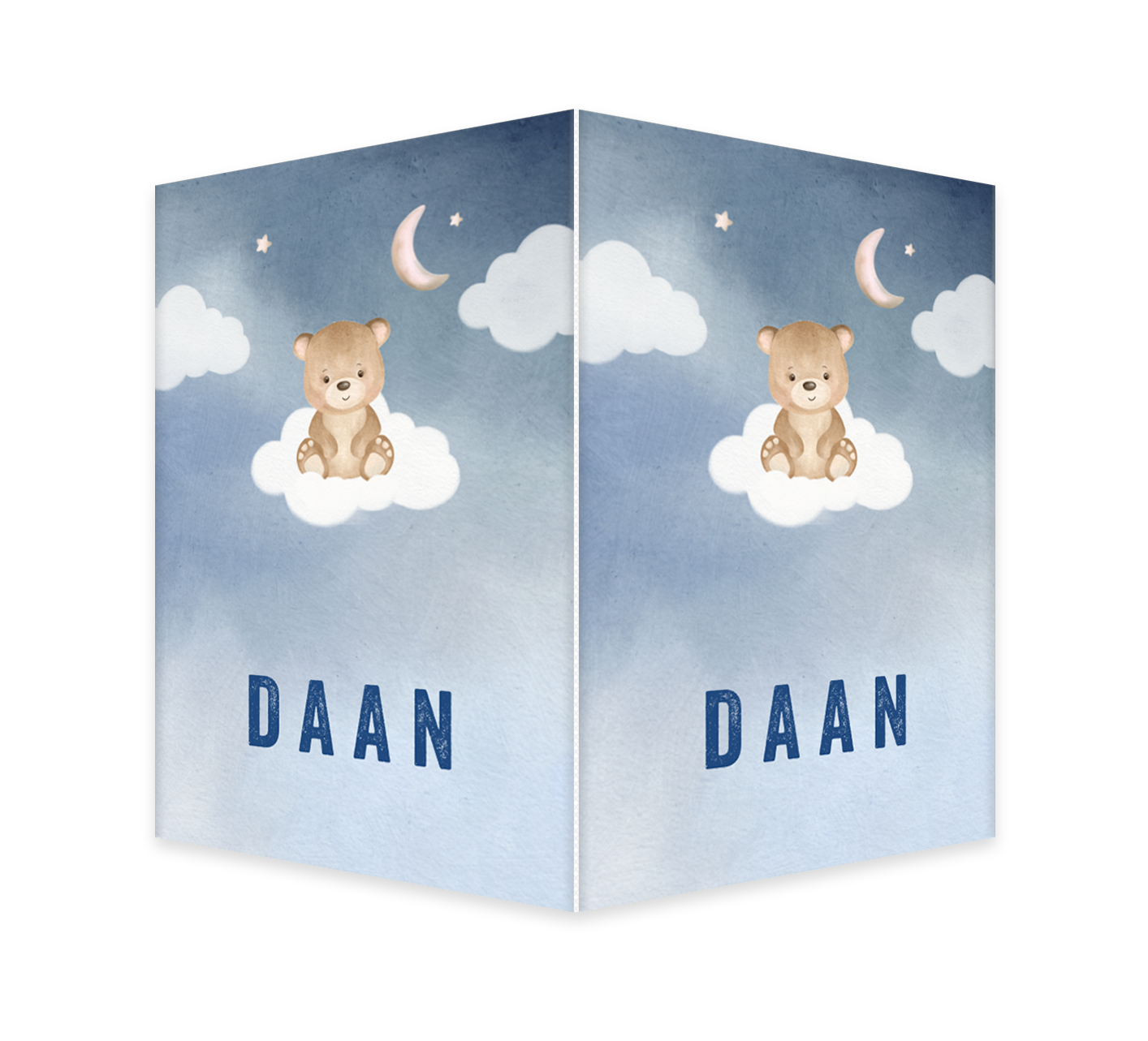 Een lief geboortebord om de geboorte van jouw kindje aan te kondigen. Het bord heeft een blauwe lucht achtergrond met daarop een sterrenhemel. Op een van de wolkjes zit een beertje. Pas het bord naar wens aan in onze online editor.
