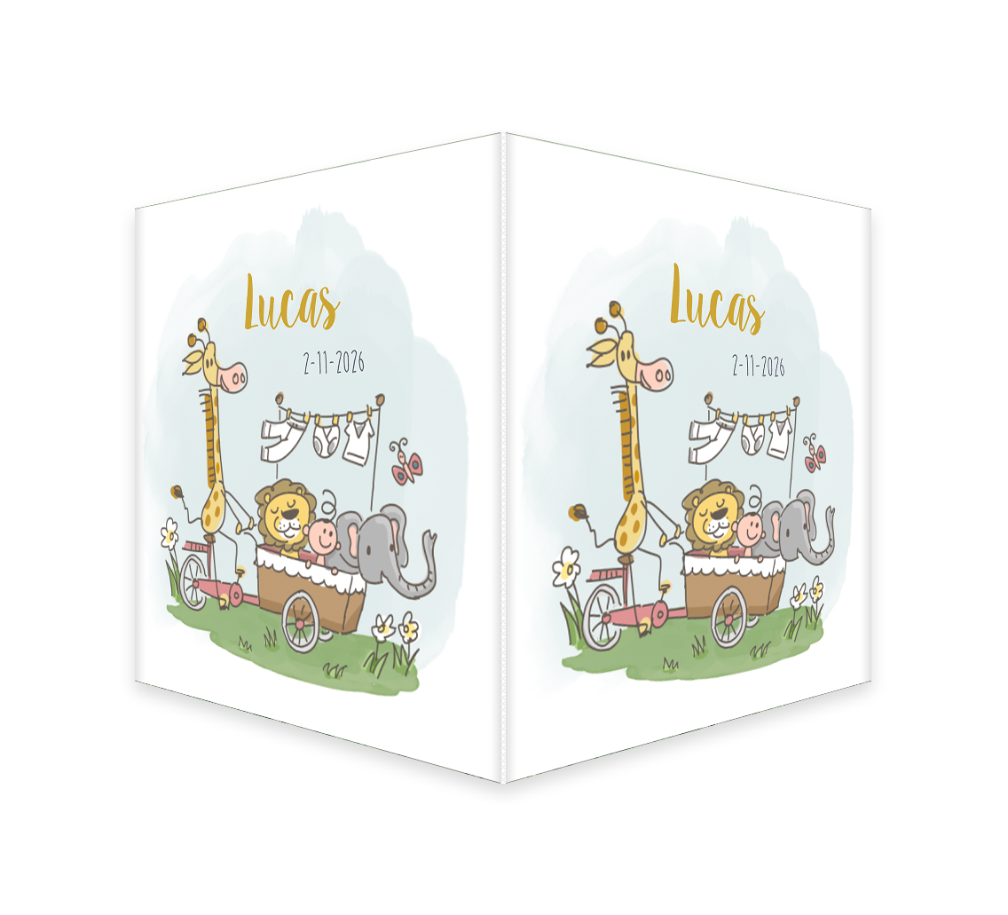 Kondig de geboorte van jullie kindje aan met een eigen ontworpen geboortebord van 50x50cm! Dit is een vrolijk raambord met jungledieren in een bakfiets. De dieren rijden samen met baby door het gras. Je maakt één zijde op in de editor en dit wordt vervolgens op twee zijdes gedrukt.