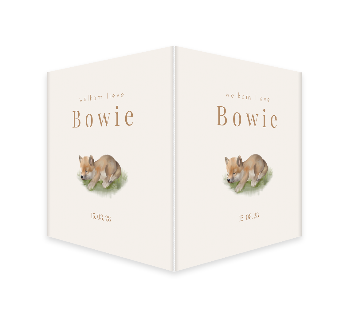 Laat iedereen weten dat je kleintje is geboren met dit raambord. Op het bord zie je de watercolour illustratie van een slapende wolf in het gras. Het bord is naar wens aan te passen in onze online editor.