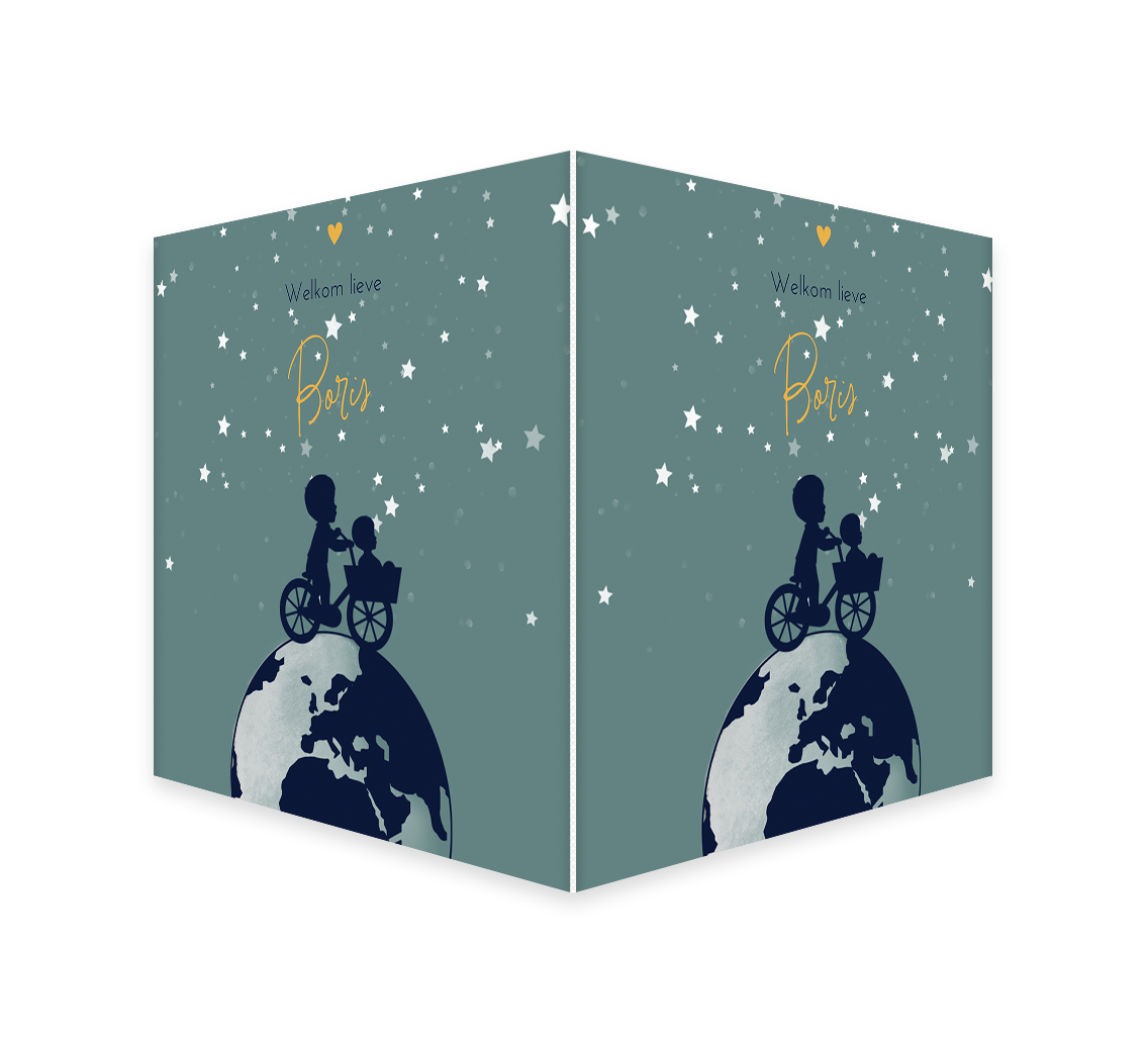 Kondig de geboorte van jullie zoontje aan met dit leuke geboortebord! De sterretjes sluiten mooi aan bij de achtergrond. Daarnaast is er een halve wereldbol te zien met silhouetjes van twee broertjes op de fiets. Het makelaarsbord kan gemakkelijk bewerkt worden in onze online editor. Je maakt één zijde op in de editor en dit wordt vervolgens op twee zijdes gedrukt.