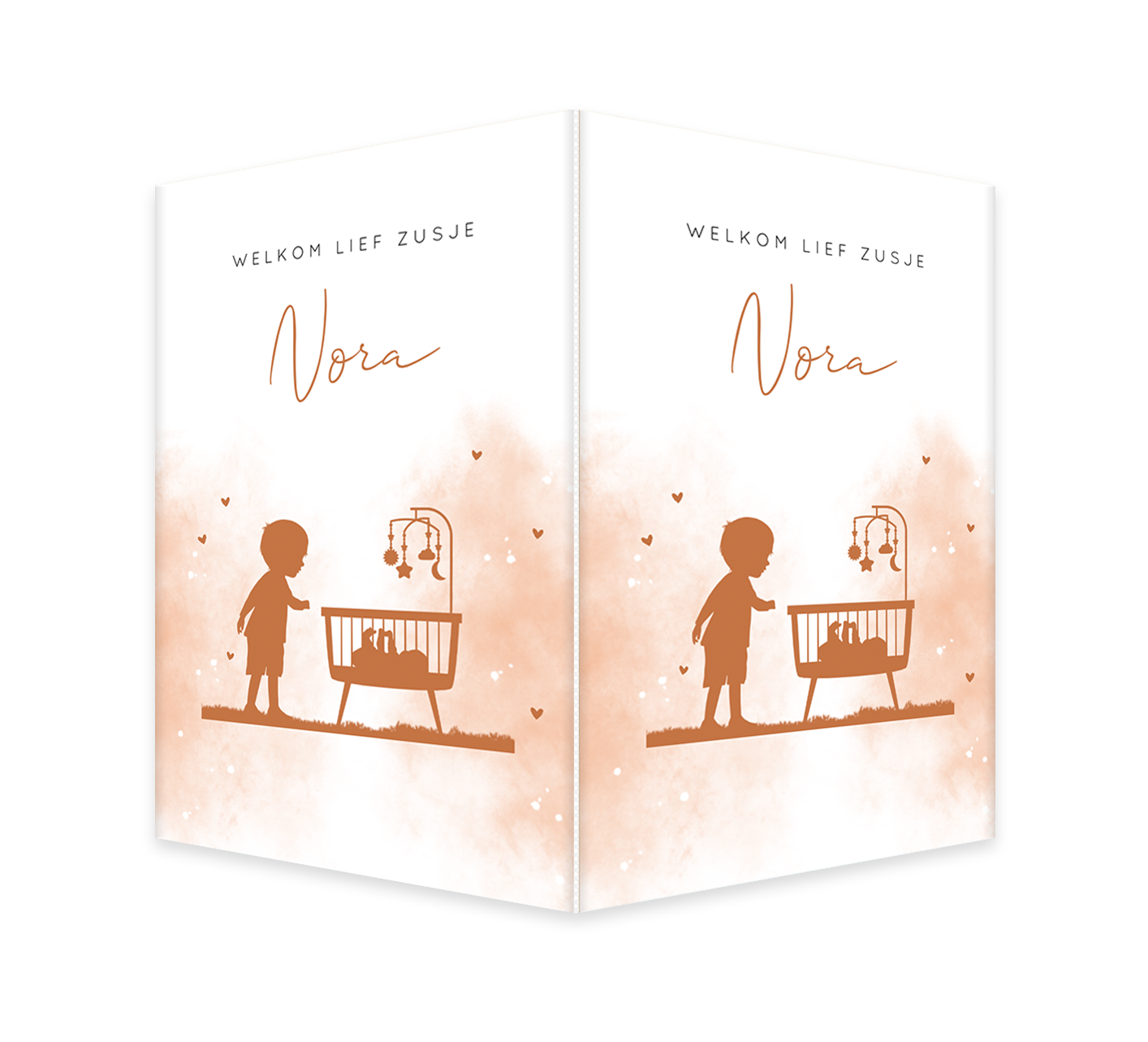 Een lief raambord om de geboorte van jouw kindje aan te kondigen. Het bord heeft een mooie watercolour achtergrond met daarop een lief silhouetje van een grote broer boven het wiegje. Om de silhouetjes heen zie je verschillende kleine hartjes. Pas het ontwerp naar wens aan in onze editor.