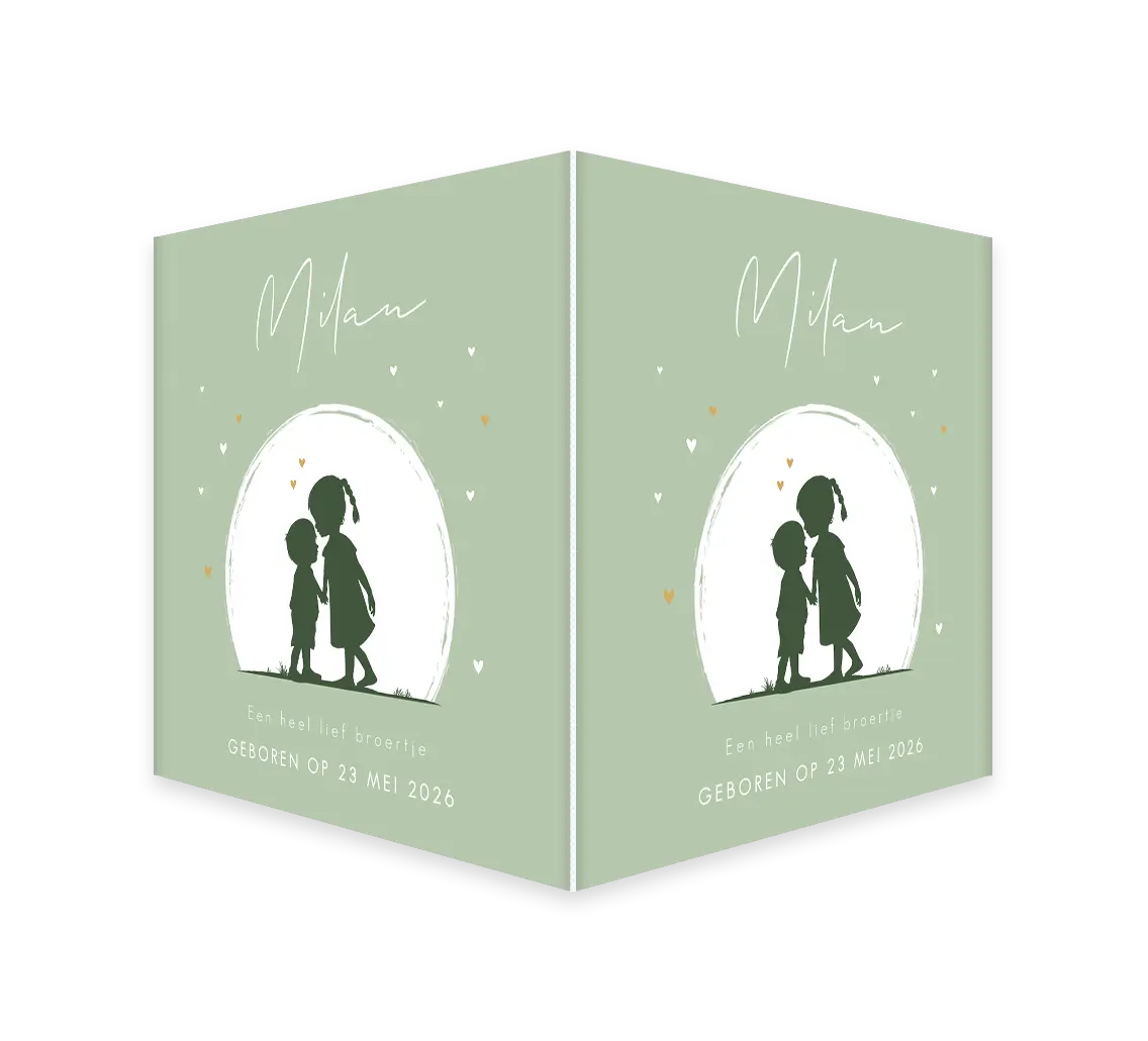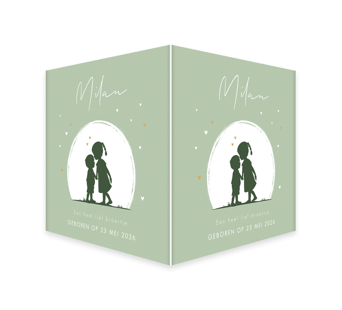 Laat de hele buurt weten dat je zoontje is geboren met dit raambord! Het bord heeft een groene achtergrond. Tegen een witte zon zijn de silhouetjes van een broertje met grote zus te zien. Het bord kan naar wens aangepast worden in onze online editor.