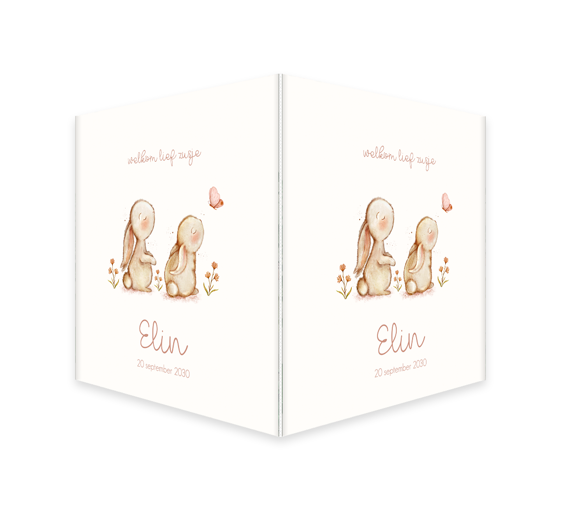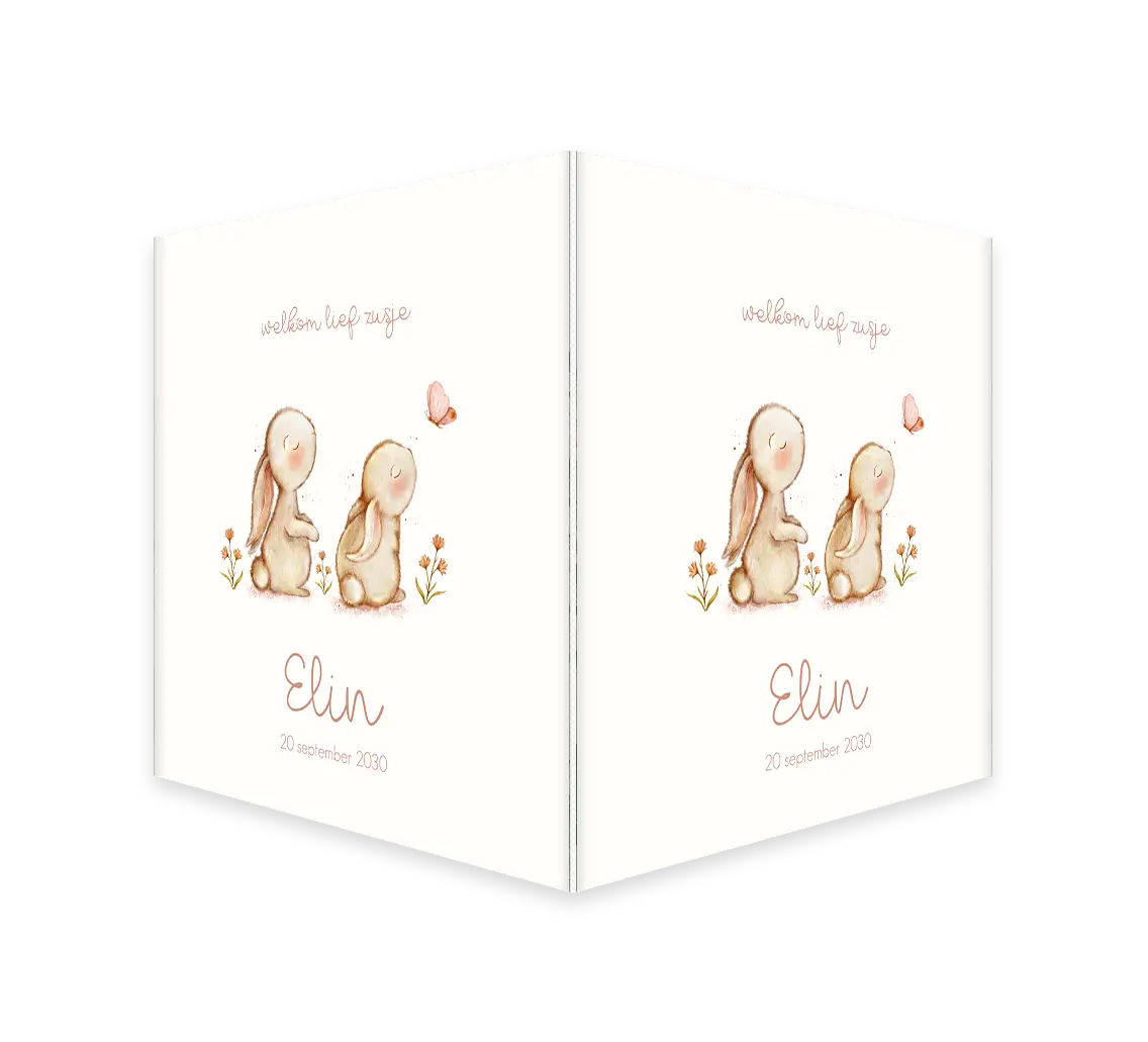 Kondig de geboorte van jullie kindje aan met dit lieve geboortebord! Dit bord heeft twee lieve konijntjes, een grote zus met haar kleine zusje. Pas het bord gemakkelijk zelf aan in onze online editor. Je maakt één zijde op in de editor en dit wordt vervolgens op twee zijdes gedrukt.