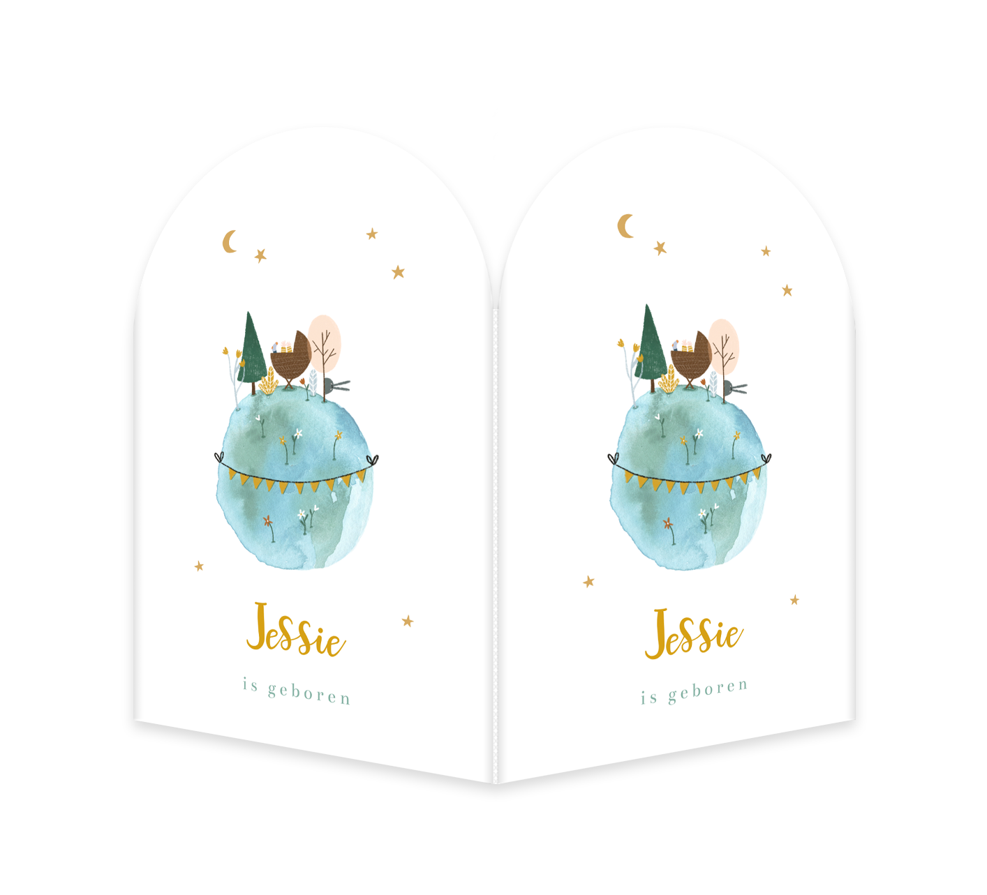 Kondig de geboorte van jullie kindje aan met een eigen ontworpen geboortebord! Deze archvorm geboortebord heeft een schattige illustratie van een wereldbol met wiegje. Daarom heen zie je een sterrenhemel.