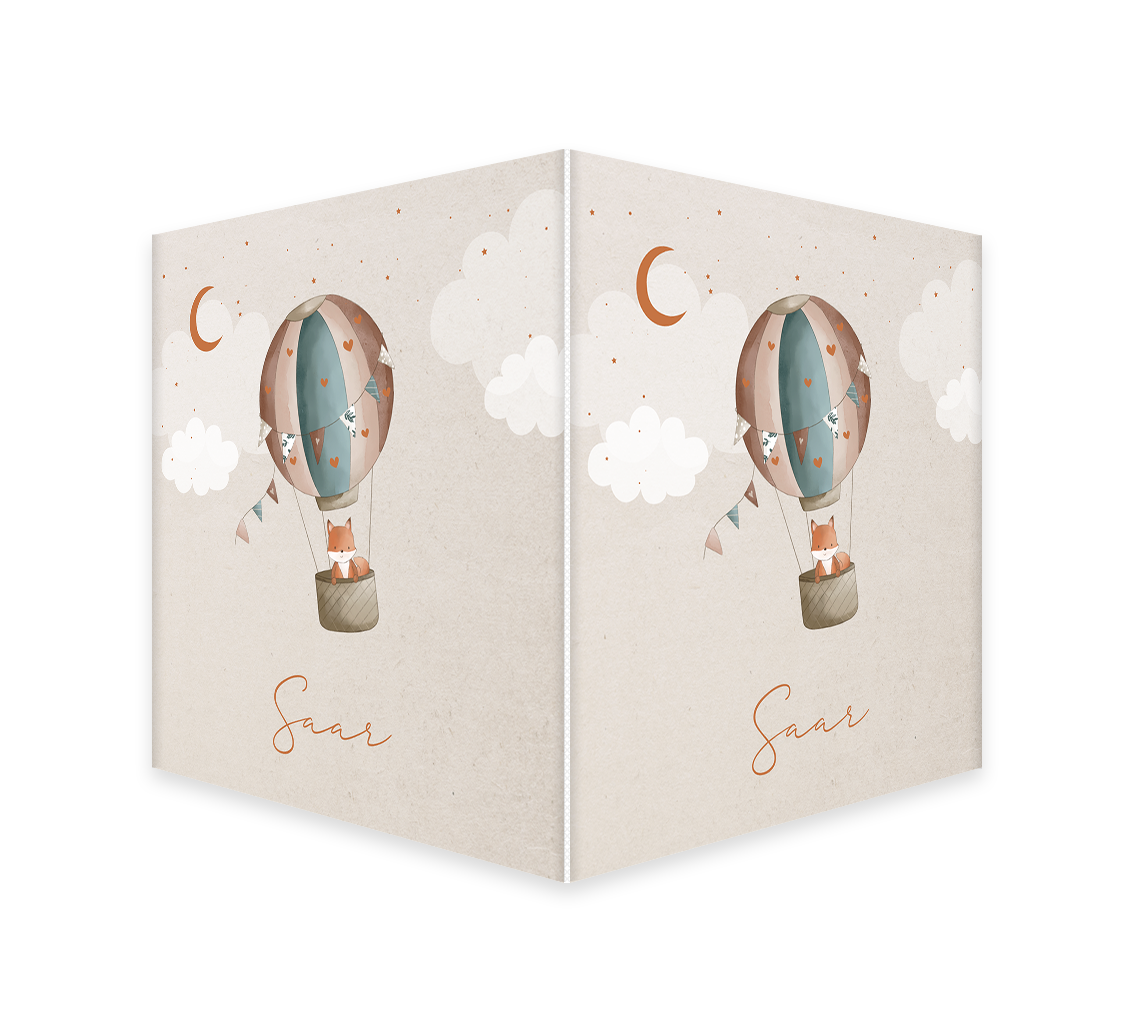 Een vrolijk raambord om de geboorte van jullie kindje aan te kondigen! Het bord heeft een beige structuur achtergrond met daarop een vosje in een luchtballon. De luchtballon vliegt tussen de wolkjes. Pas het raambord naar wens aan in onze online editor.