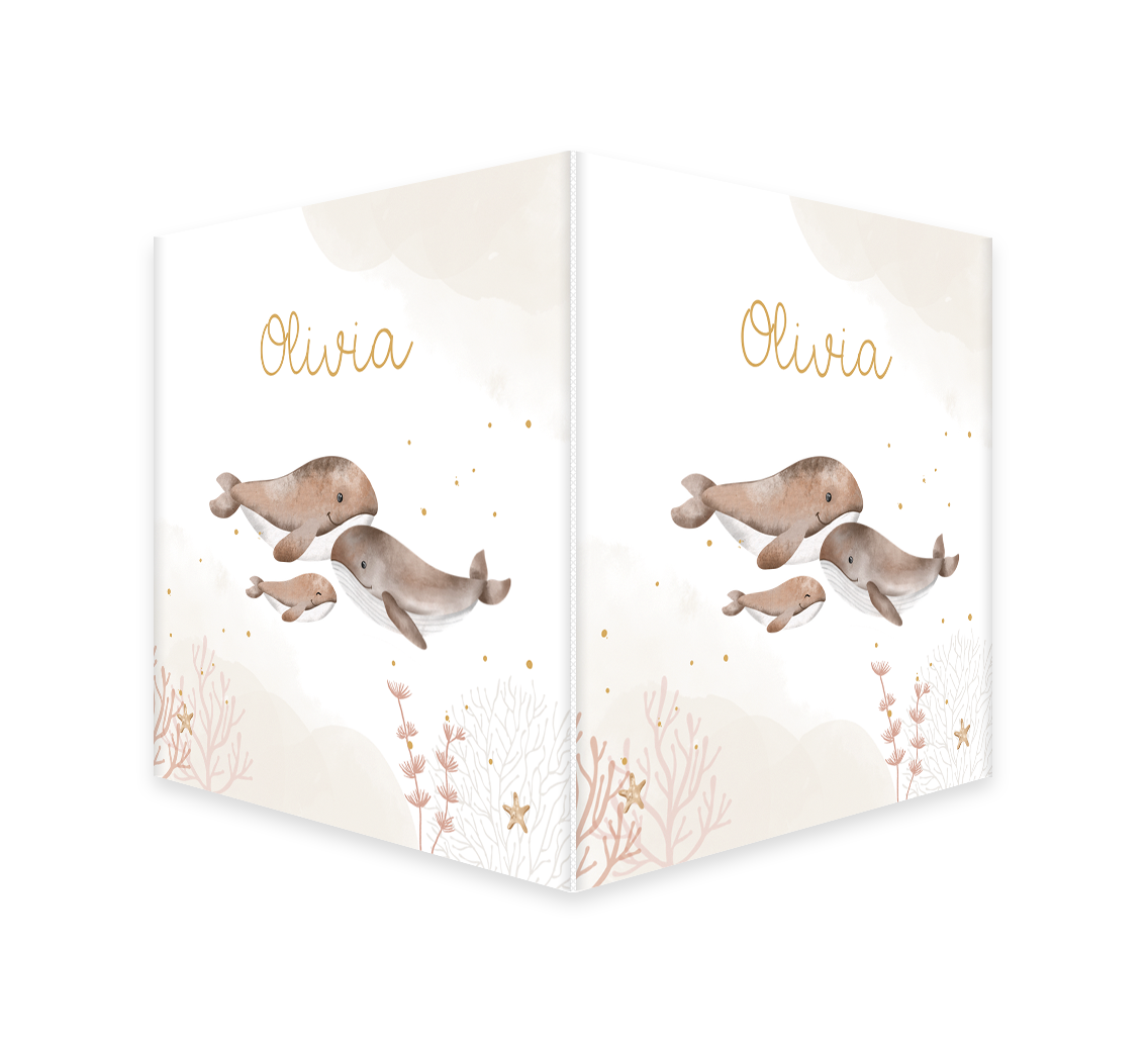 Een lief geboortebord passend bij het geboortekaartje. Het bord heeft beige tinten en prachtige illustraties van walvissen in de zee. Pas het ontwerp naar wens aan in onze online editor.